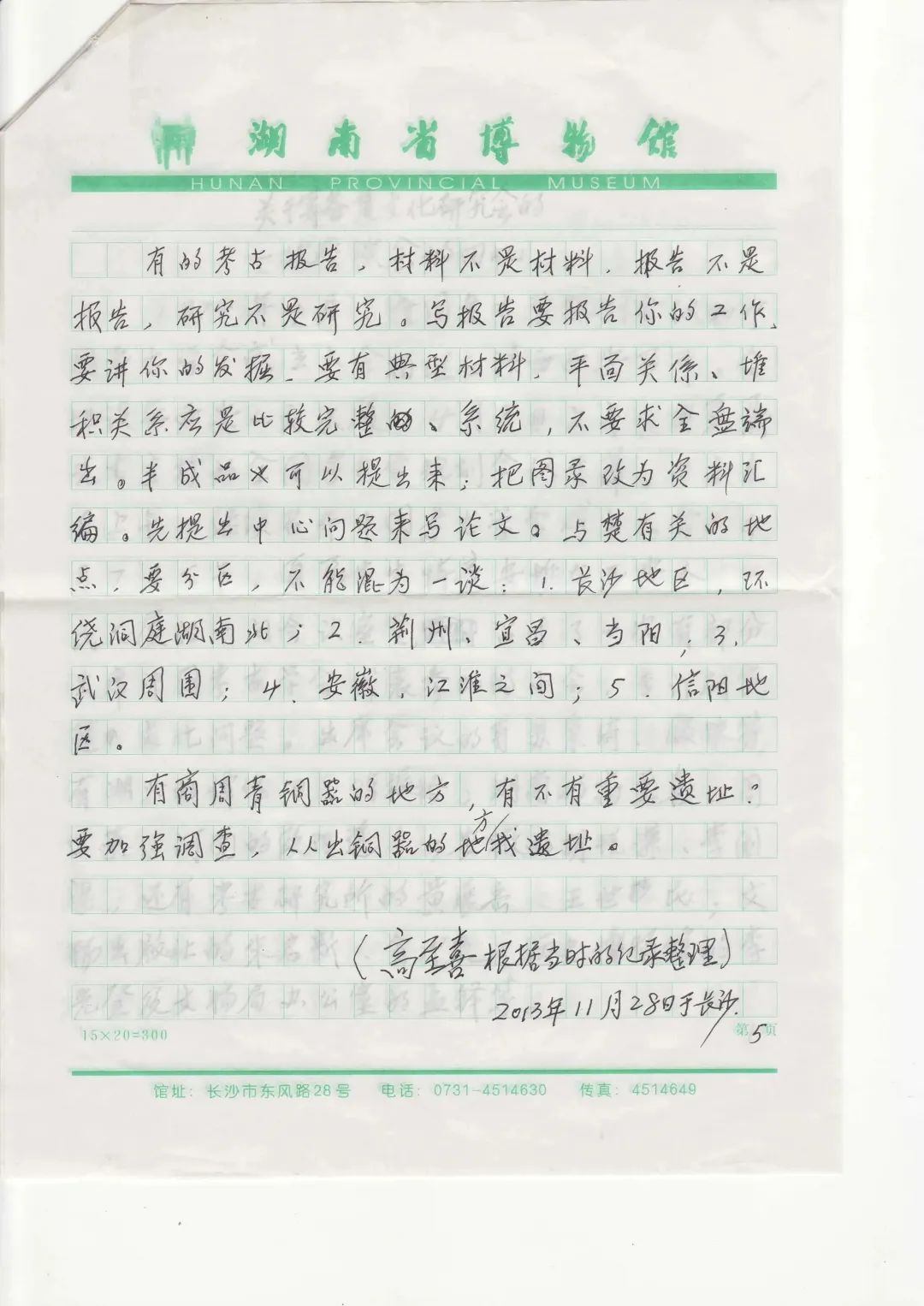 “从此之后,我几乎每次去湖南都会拜访高至喜先生,高先生退休后依然每日去博物馆继续他的研究工作,陆续出版了《长沙楚墓》、《楚文化的南渐》、《楚文化图典》等专著,令我十分敬佩。2007年,作为编撰会的活动之一,湖南省博物馆和上海博物馆联合举办了《湖南出土商代晚期至西周时期青铜器学术研讨会》,期间我和李伯谦、彭适凡等几位专家专程去宁乡等地考察,高至喜先生虽已高龄仍陪同前往,在宁县山上为我们指点四羊方尊和象纹大铙的出土地点,并详述周边环境和南方青铜器埋藏、的特殊形式。