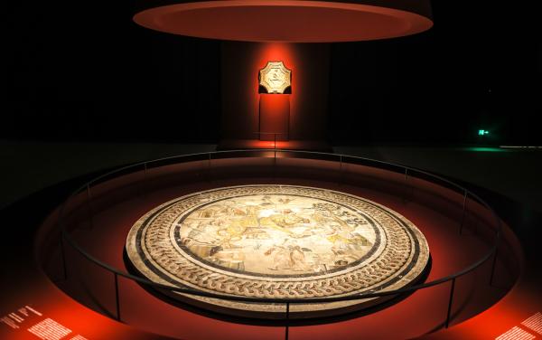 浦东美术馆“那不勒斯展”展览现场,地面为《狮子和酒神游行场景⻢赛克》石质⻢赛克,公元前1世纪,庞⻉,那不勒斯国家考古博物馆藏;墙面为《粉饰灰泥吊顶》,灰泥,公元1世纪,维苏威火山遗址,那不勒斯国家考古博物馆藏