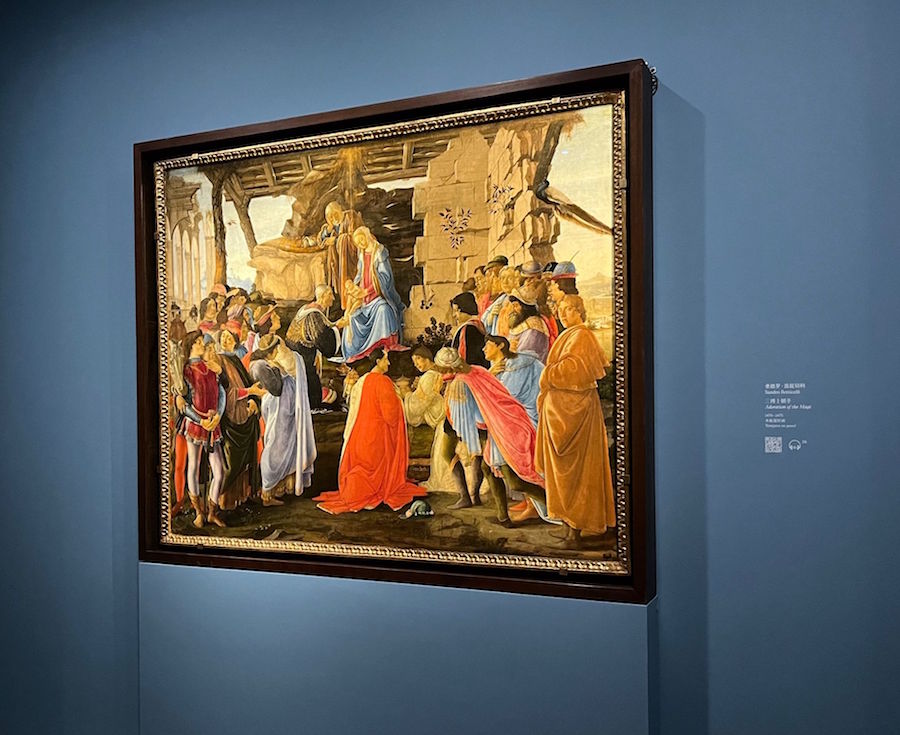 东一美术馆“波提切利与文艺复兴”展览现场,波提切利《三博士朝圣》,画中右一被认为是波提切利自画像。