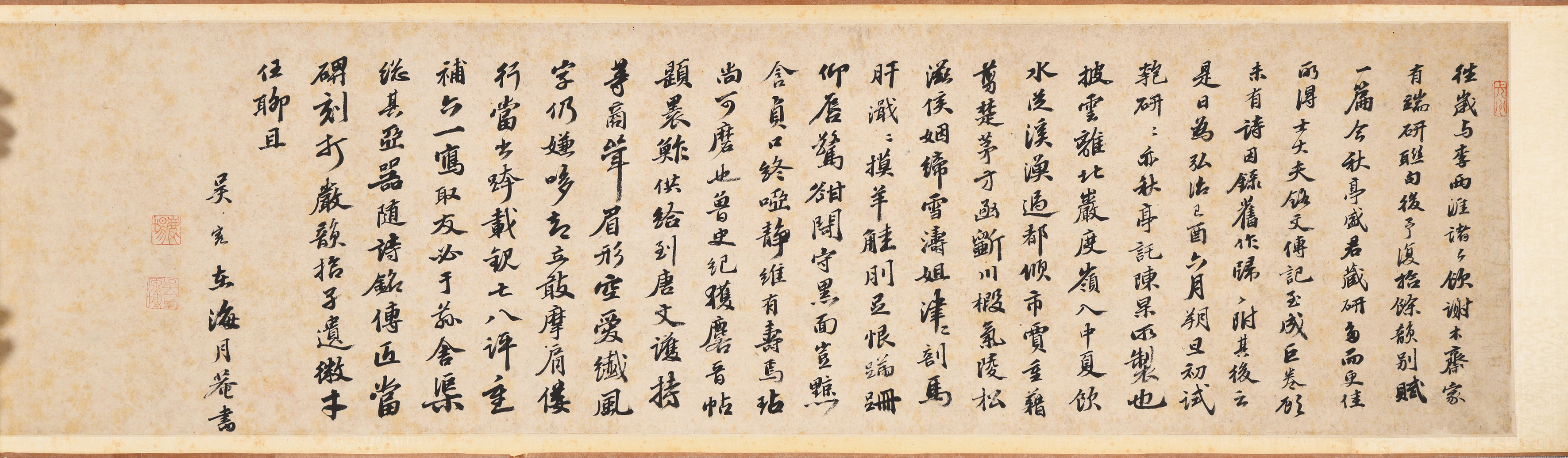 吴宽是明成化、弘治诗坛的代表人物之一,尤工行书,师法苏轼,一改明初以来的台阁体书风,与徐有贞、李应祯、沈周、王鏊同为“吴门书派”的先导。邢侗评为:“匏翁吴中前辈,行谊擅绝,不直文翰之工尔也。书法苏学士,浓颜厚面,祛去吴习。”此卷是弘治二年(1489)吴宽在北京为盛秋亭行书苏轼《端砚诗》:“往岁与李西涯诸公饮谢木斋家,有端研联句,后予复拾余韵,别赋一篇。今秋亭盛君藏研多而更佳,所得士大夫铭文传记至成巨卷,顾未有诗,因录旧作附归其后云。是日为弘治己酉六月朔旦,初试匏研,研亦秋亭托陈杲所制也。”李西涯即李东阳,谢木斋即谢迁,卷中字字独立却通篇气韵生动,一改台阁体程式化的面貌,时见精彩之笔,足见才情。