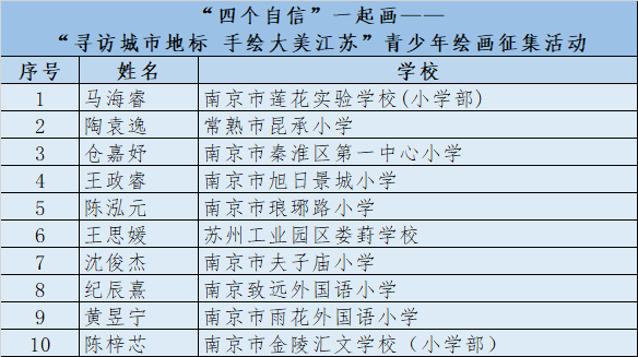 10月17日,扬子晚报少年志融媒平台特别推出“四个自信”一起画——“寻访城市地标手绘大美江苏”青少年绘画征集活动,受到了江苏中小学生的广泛关注和踊跃投稿。经过层层选拔,活动获奖名单已出炉,速来围观!
