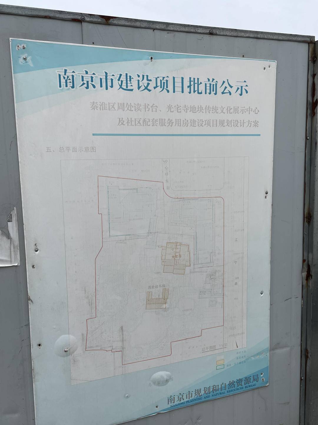 记者跟随导航,从剪子巷找到小心桥东街尽头的“周处读书台”,其四面正在进行围挡施工。围挡上的告示显示此处为“秦淮区周处读书台、光宅寺地块传统文化展示中心及社区配套服务用房建设项目”。