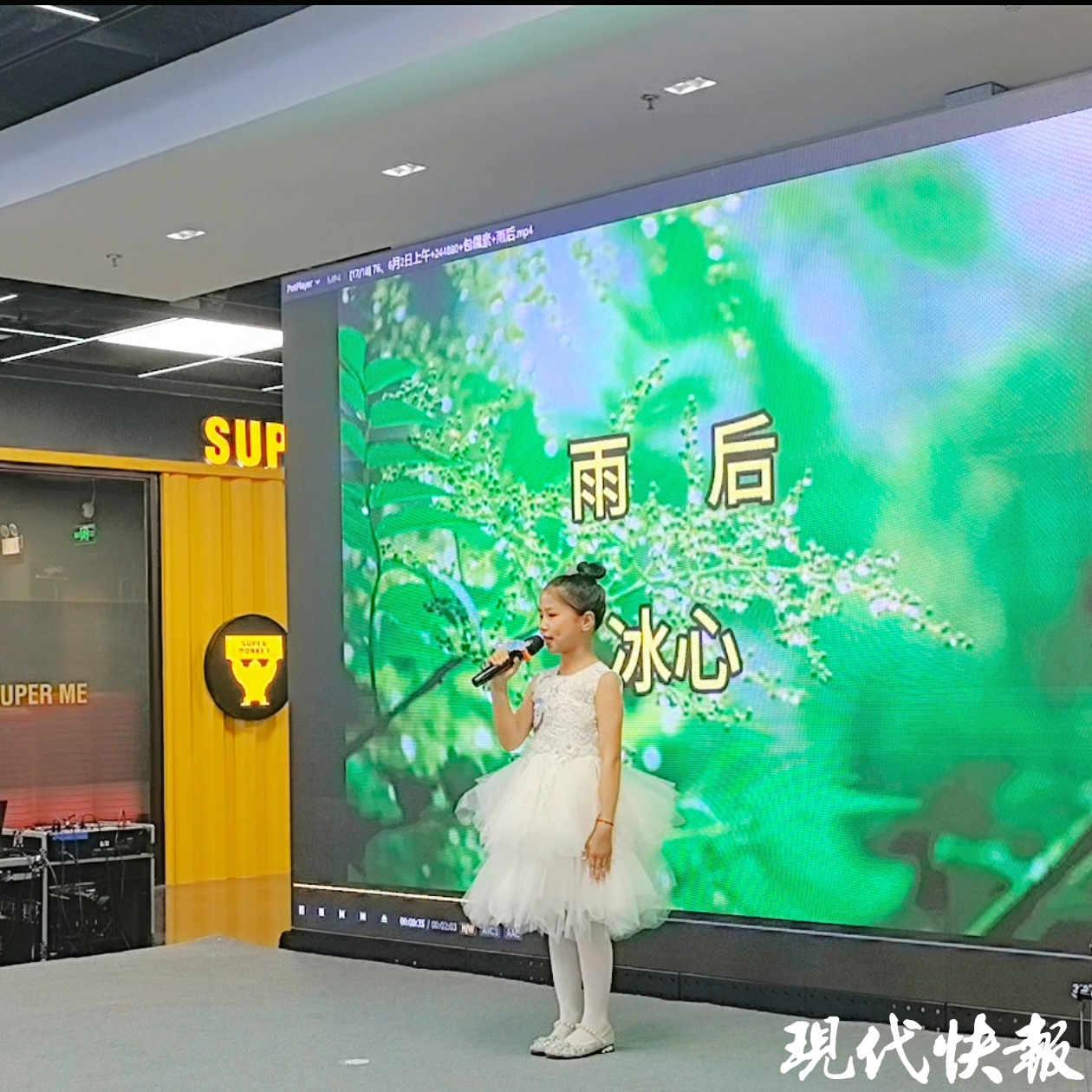 本届大赛评委、江苏省朗诵协会理事、国家文旅部语言表演注册教师、静美与亚当读诗时间发起人陈静美告诉记者:“本届大赛中,孩子们的参赛作品题材更加广泛,既有中华文化瑰宝古典文学中的诗词,如《满江红》《将进酒》等;也有传承红色基因的文章,如《永远的九岁》《永远的丰碑》等,还有当下观照现实的歌颂祖国、歌颂人民的题材,如《青春中国》等,以及符合孩子们年龄特点的儿歌、童话、寓言故事、成语故事等,甚至有一些家长和孩子特地为大赛共同创作了文章。孩子们的视野特别开阔,围绕真善美的主题抒发对祖国的热爱,对当下美好生活的珍惜,培养了孩子们的爱国情怀,根植红色基因,赛场仿佛变身为语文大课堂。”