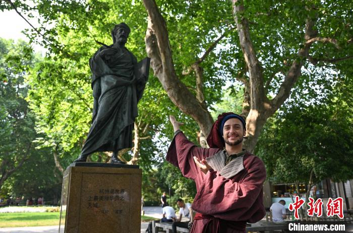 当天,“新马可·波罗”们抵达杭州后首站便是前往马可·波罗纪念雕像。在这里,在浙大学习的意大利留学生Joseph在纪念雕像下变装“马可·波罗”。他表示,马可·波罗将杭州形容成“世界上最美丽华贵之天城”,他也觉得杭州是他心中的天堂。
