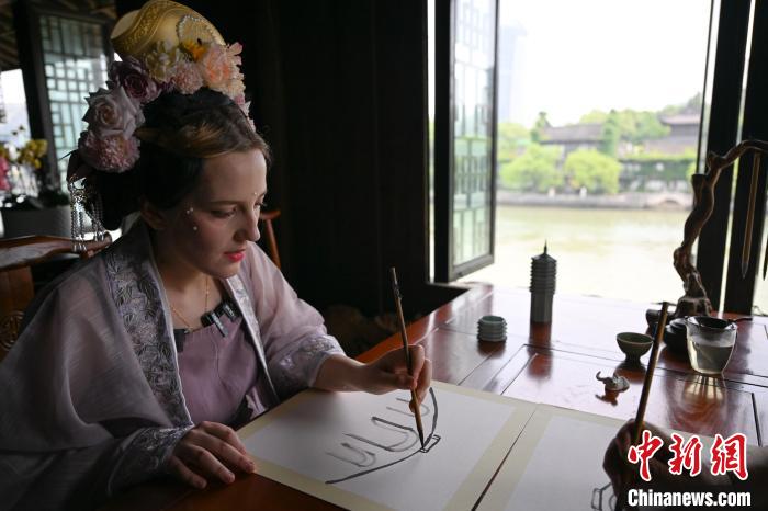 来自意大利的网红博主瑞丽学习中国画。 王刚摄