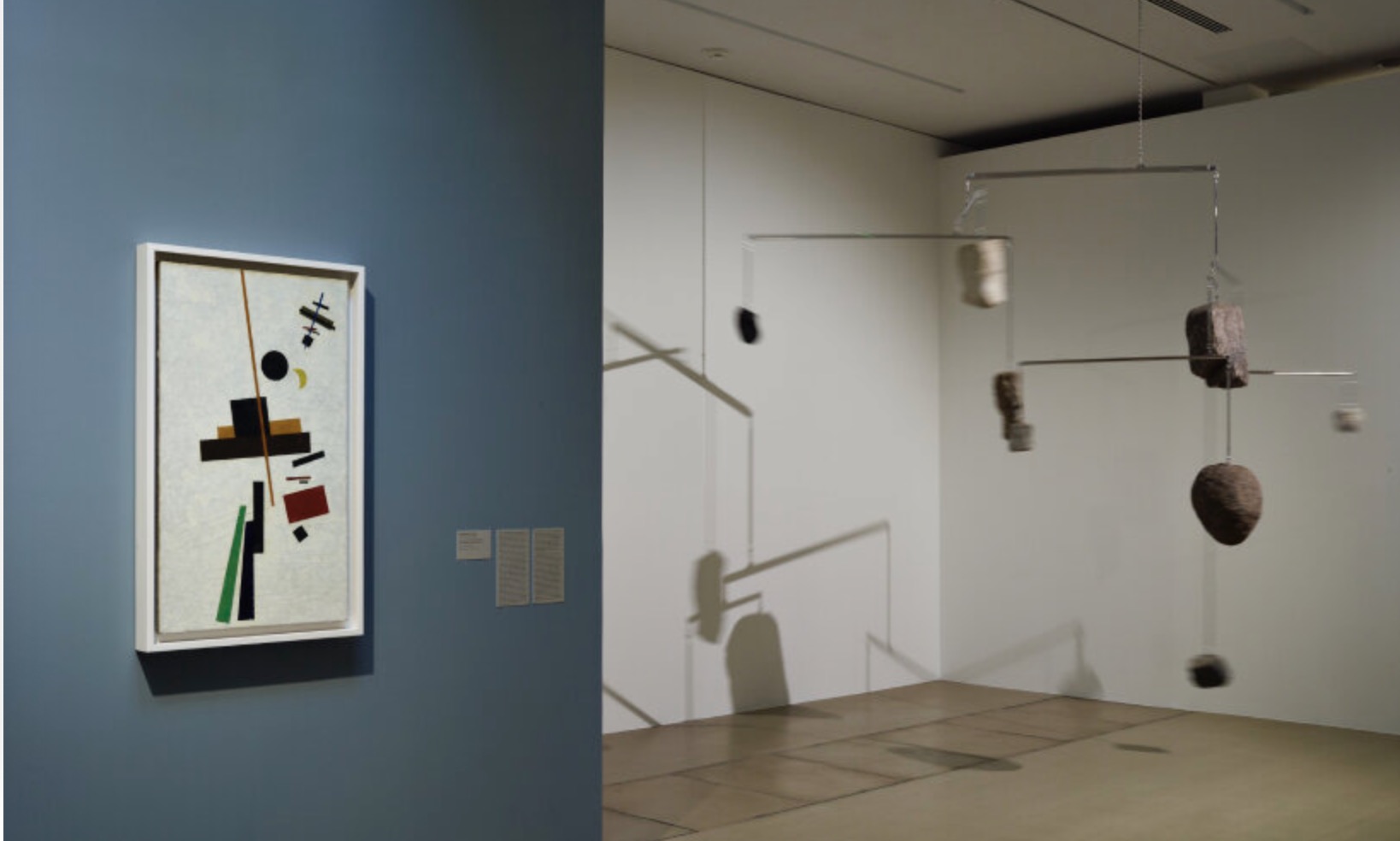 展览现场,左:马列维奇,《宇宙结构》,1916,104×59.5cm;右:阿丽莎·柯维德(AlicjaKwade),《超重的天空》,2022年