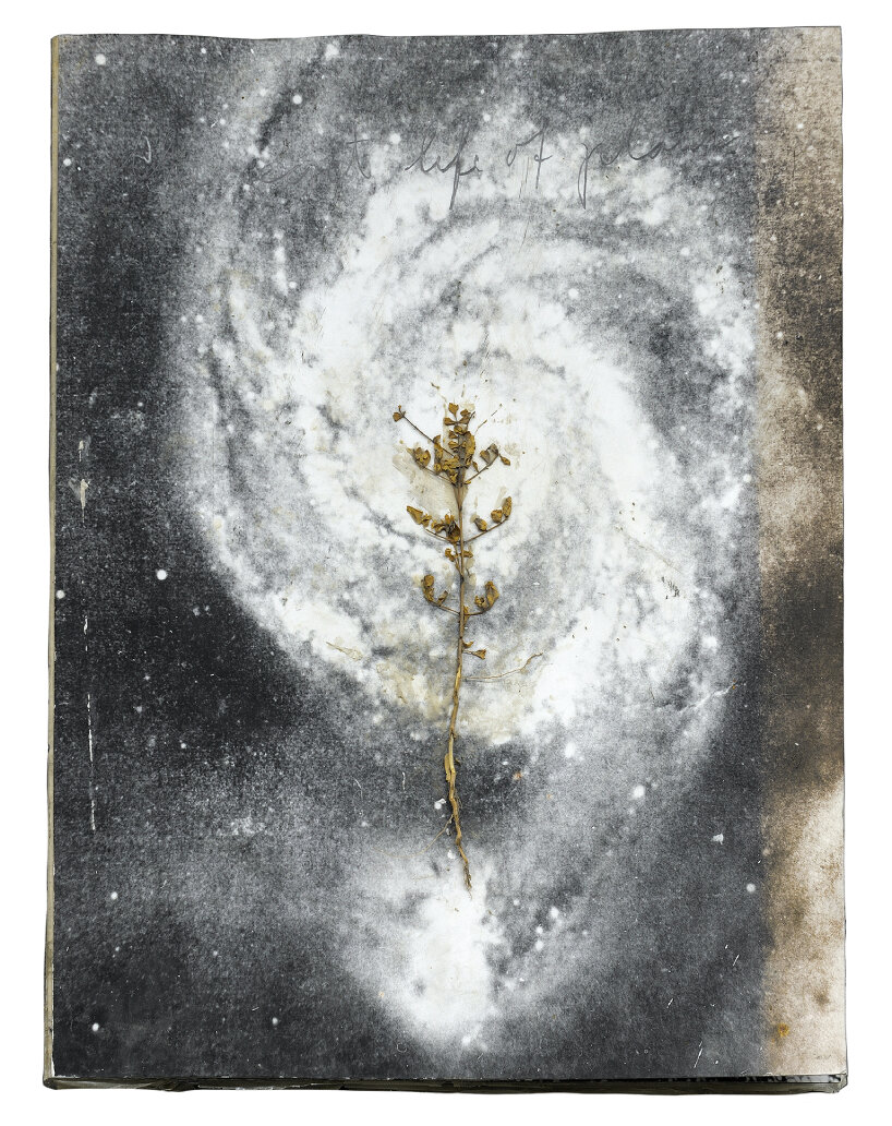 在当代艺术领域,基弗的《植物的秘密生活》(TheSecretLifeofPlants,2004)将一个白色漩涡围绕着黑洞盘旋,一根金色的枯萎茎干被放置在中心。这是他同名雕塑书的姊妹篇,书中的铅页上点缀着白色油漆斑点,试图描绘出宇宙的光谱和古老概念。卡普尔的《无题》(2014)在一个透明的玻璃盒中,以一系列连续的小型爆炸模仿超新星,它们的残余斑点开始散开,停顿并冻结在玻璃盒的正中央。