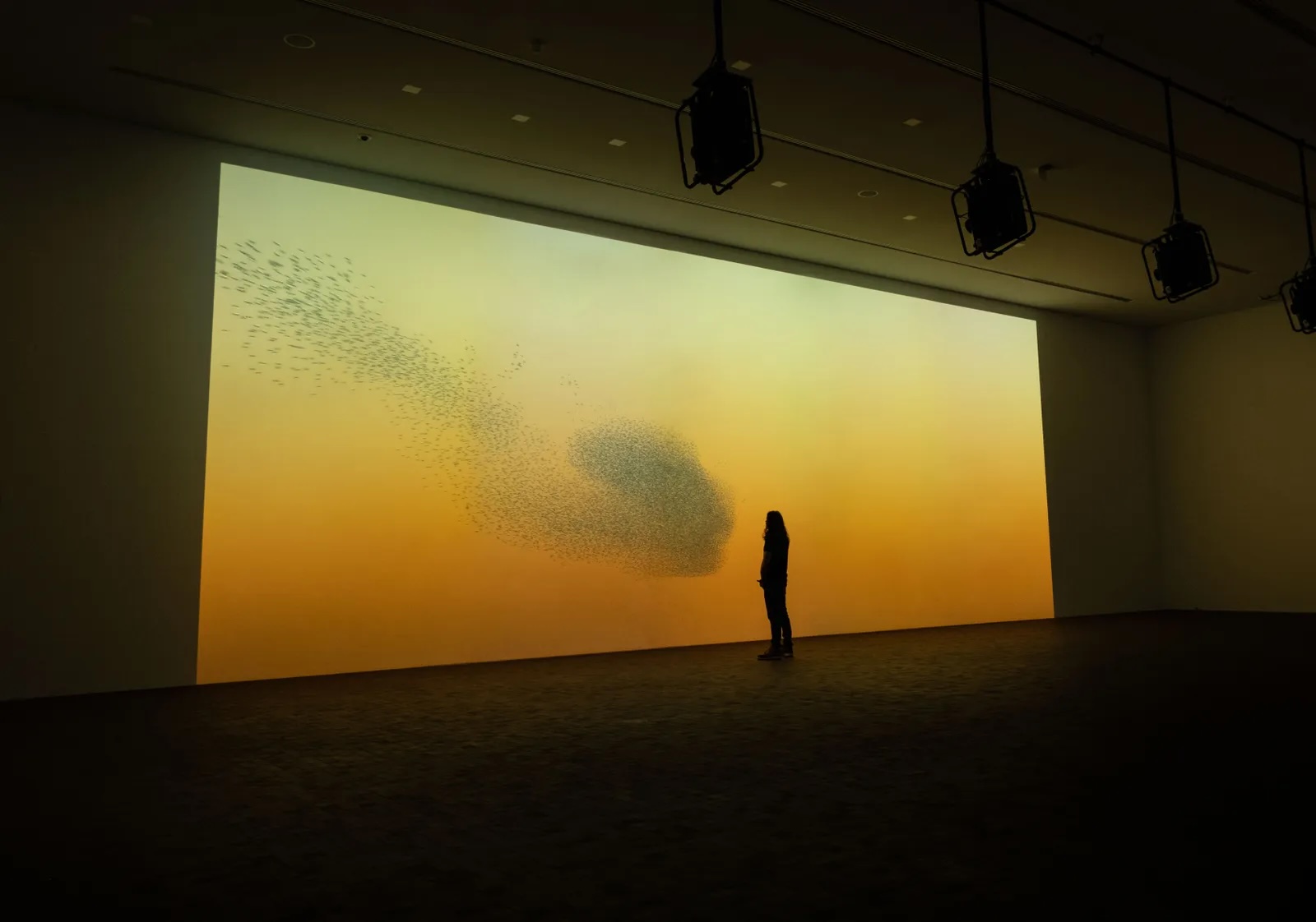 就像梵高的《罗纳河上的星夜》中煤气路灯的光芒似乎来自星星一样,展览中的许多艺术作品将自然与现代科技并置。比如,拉尔夫·诺塔和朗内克·戈迪恩将科幻和自然过程融为一体。在研究了椋鸟的飞行后,两人创作了互动艺术作品,用算法模拟群体行为。