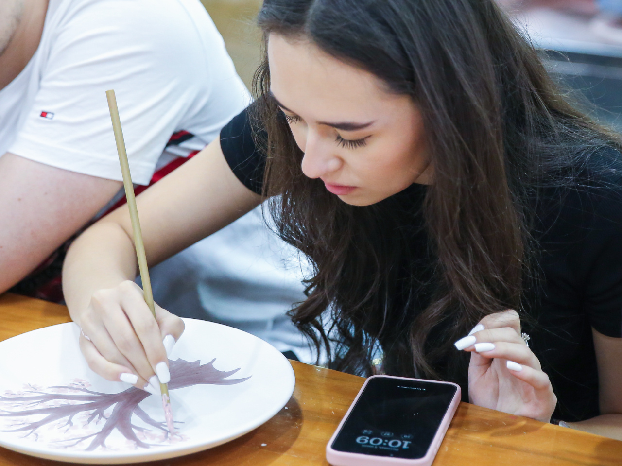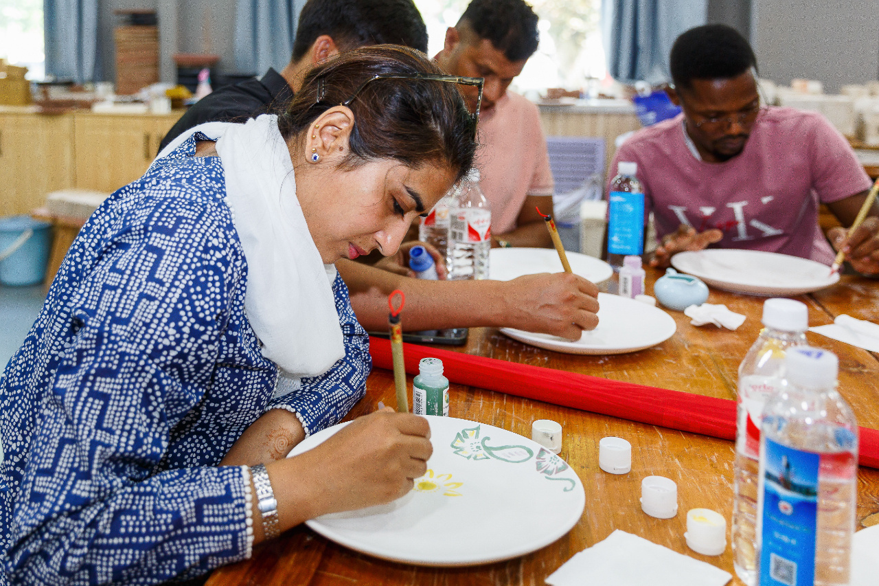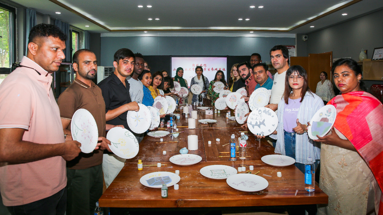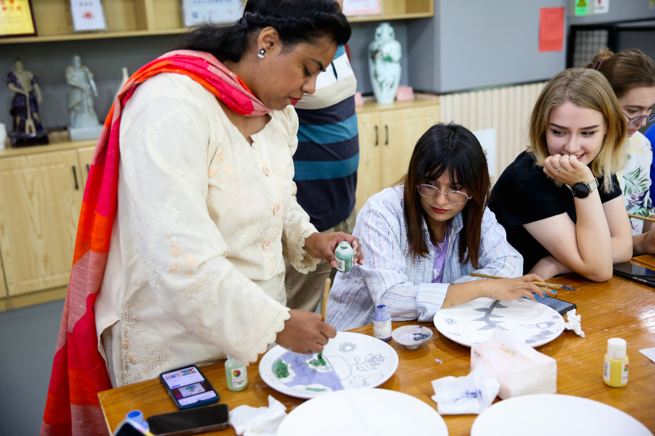 7月5日,山东水利技师学院现代管理系陶艺实训室,山东理工大学留学生在体验陶瓷彩绘。