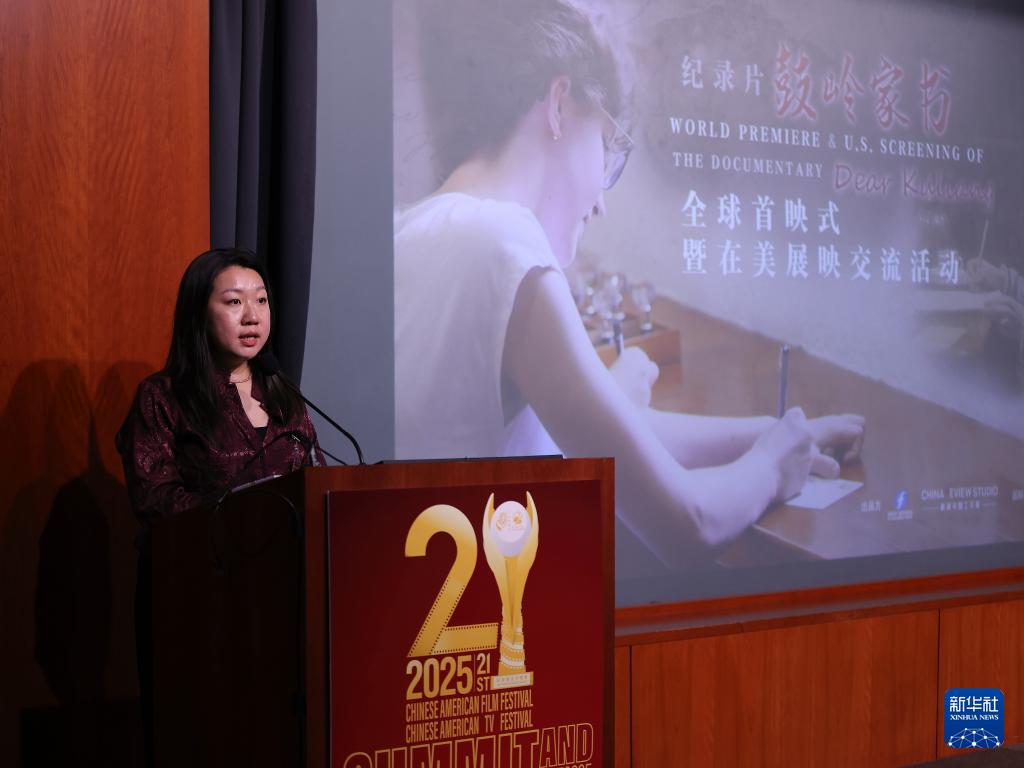 11月7日,中美合拍纪录片《鼓岭家书》制片人张玥涵在该片洛杉矶展映交流活动上致辞。新华社发(邱晨摄)
