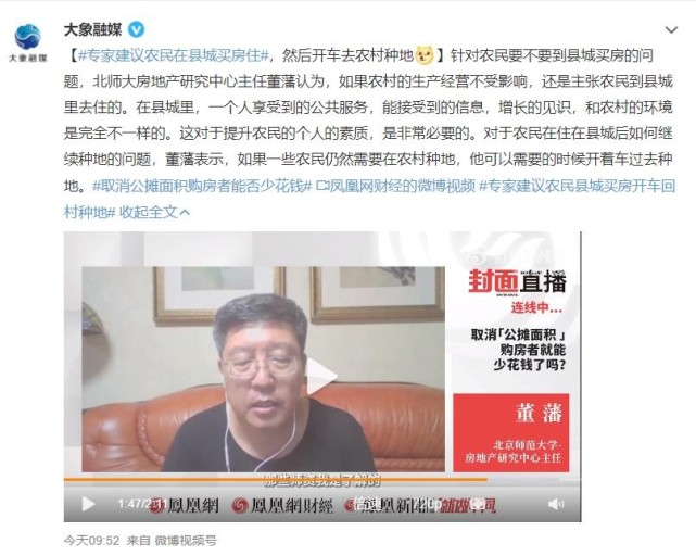 8月27日,据大象融媒援引凤凰网视频报道,北师大房地产研究中心主任董藩认为,如果农村的生产经营不受影响,还是主张农民到县城里去住的。“越大的城市越文明、越大的城市越繁荣、越大的城市越公平。”