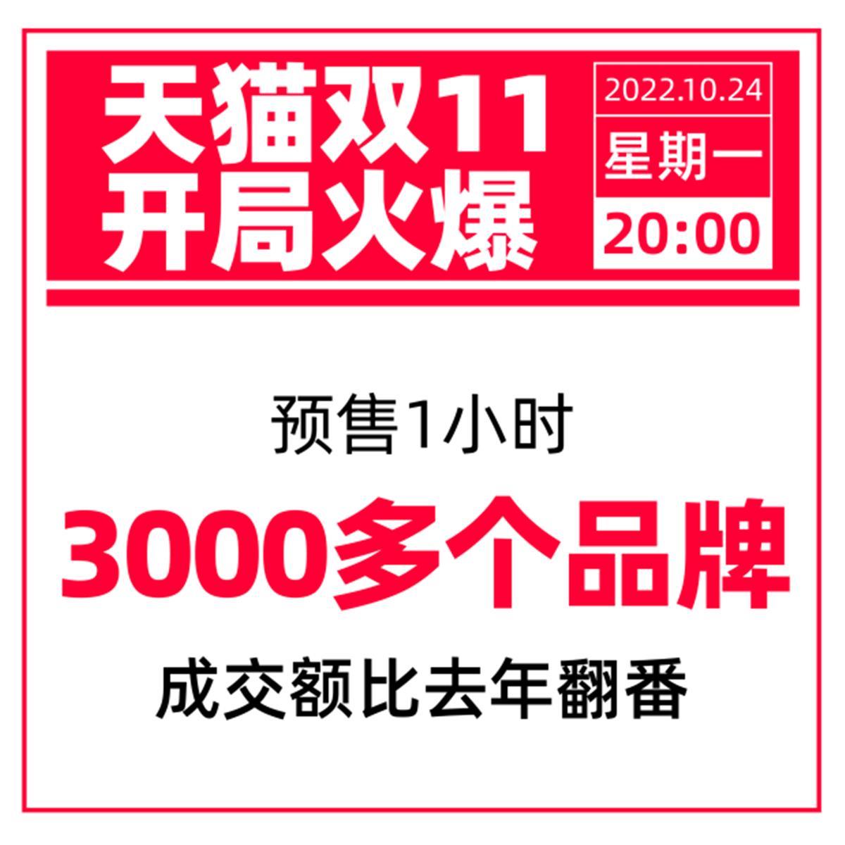 10月24日晚天猫双11预售一小时内,3000多个品牌成交额同比去年预售同期翻倍增长。