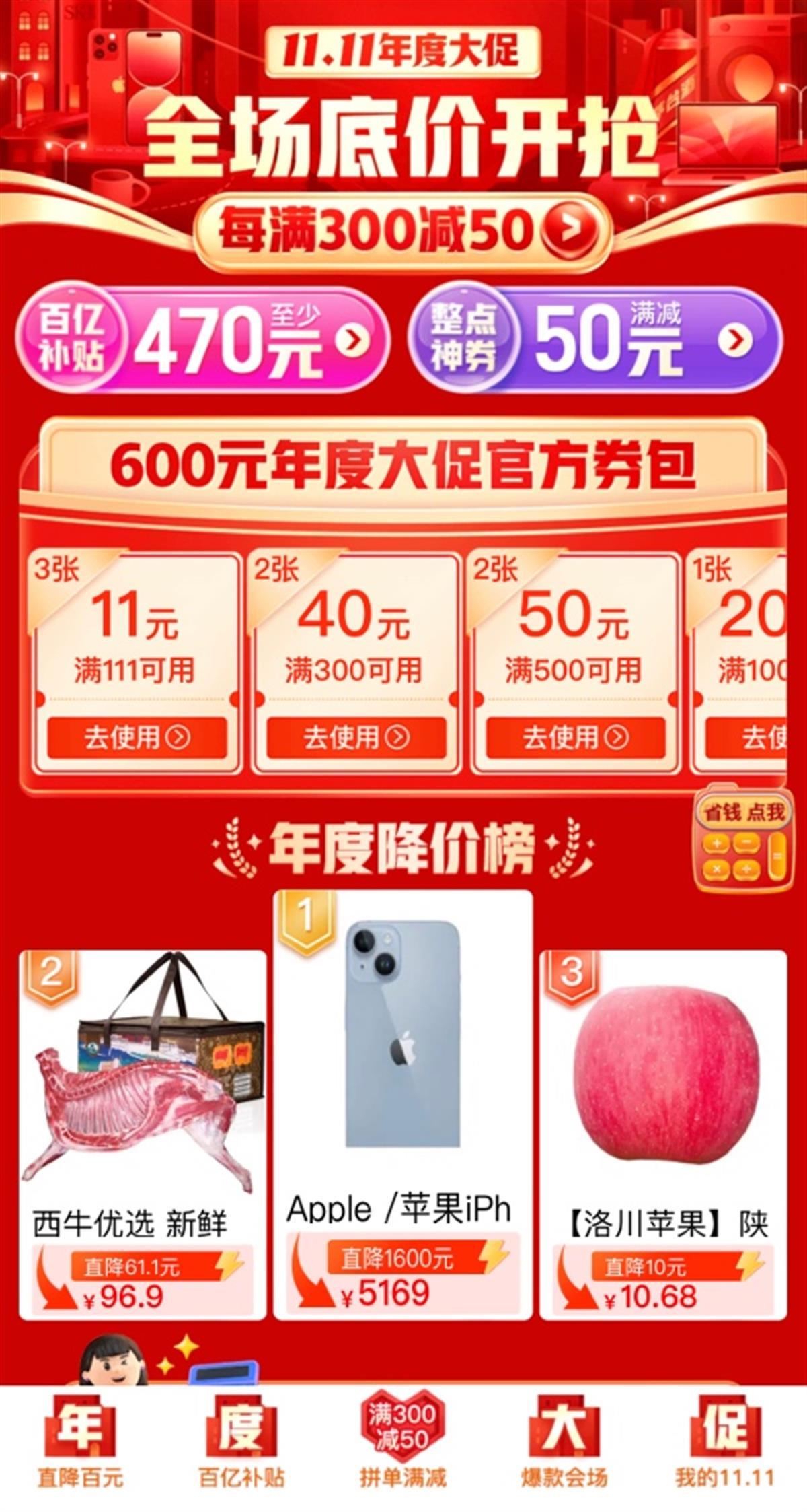 与此同时,百亿补贴频道也将对品牌好货、涉农产品提供至少470元额外券包,茅台、iPhone、神仙水、家电家具等大件消费品加补千元起。在每天的整点时刻,平台还将为用户提供满100减50的整点神券,确保消费者天天有特价,时时有惊喜。本次大促活动将额外提供两天的返场时间,一直持续至11月13日24时。