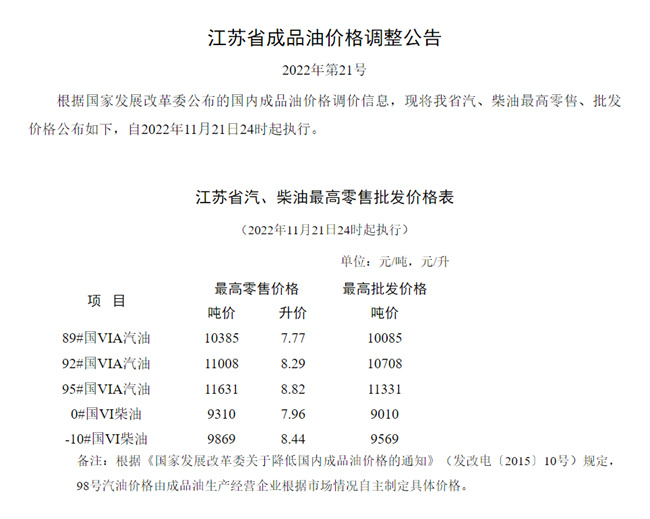 现代快报讯(记者杨晓冬)11月21日,国家发改委发布成品油调价通知,自2022年11月21日24时起,国内汽、柴油价格(标准品,下同)每吨分别降低175元和165元。现代快报记者从江苏省发改委获悉,此次调价后,江苏92号汽油、95号汽油、0号柴油分别下调至8.29元/升、8.82元/升、7.96元/升。以92号汽油每升下调0.14元计算,对于油箱容量50升的车主来说,加满一箱比调价前可省7元。