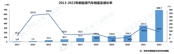 在政策和市场的双重作用下,2022年我国新能源汽车持续爆发式增长,产销分别完成705.8万辆和688.7万辆,同比分别增长96.9%和93.4%;市场占有率达到25.6%,高于上年12.1个百分点。其中受疫情影响较大的4月份同比增速仍超四成,随后也快速恢复至高位。