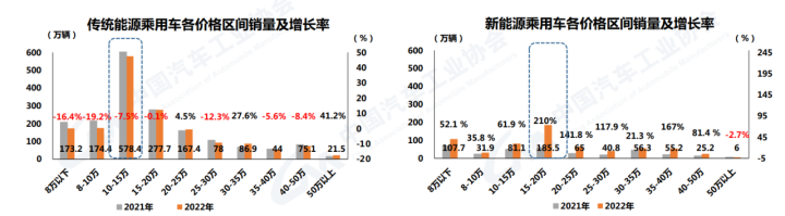 而新能源乘用车,目前主要销量贡献集中于15万-20万元的价位区间,全年累计销量185.5万辆,同比增长最为显著,达到2.1倍。除50万元以上市场,新能源乘用车其他各价格区间同比均呈增长态势,消费结构呈现多元化特征。