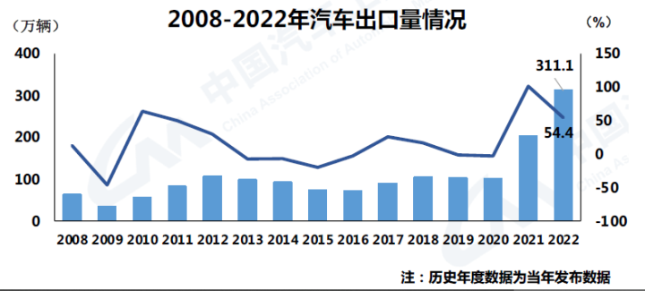 过去一年,由于海外供给不足和中国车企出口竞争力的大幅增强,有效拉动了我国汽车行业整体增长。2022年,我国汽车出口突破300万辆,达到311.1万辆,同比增长54.4%。