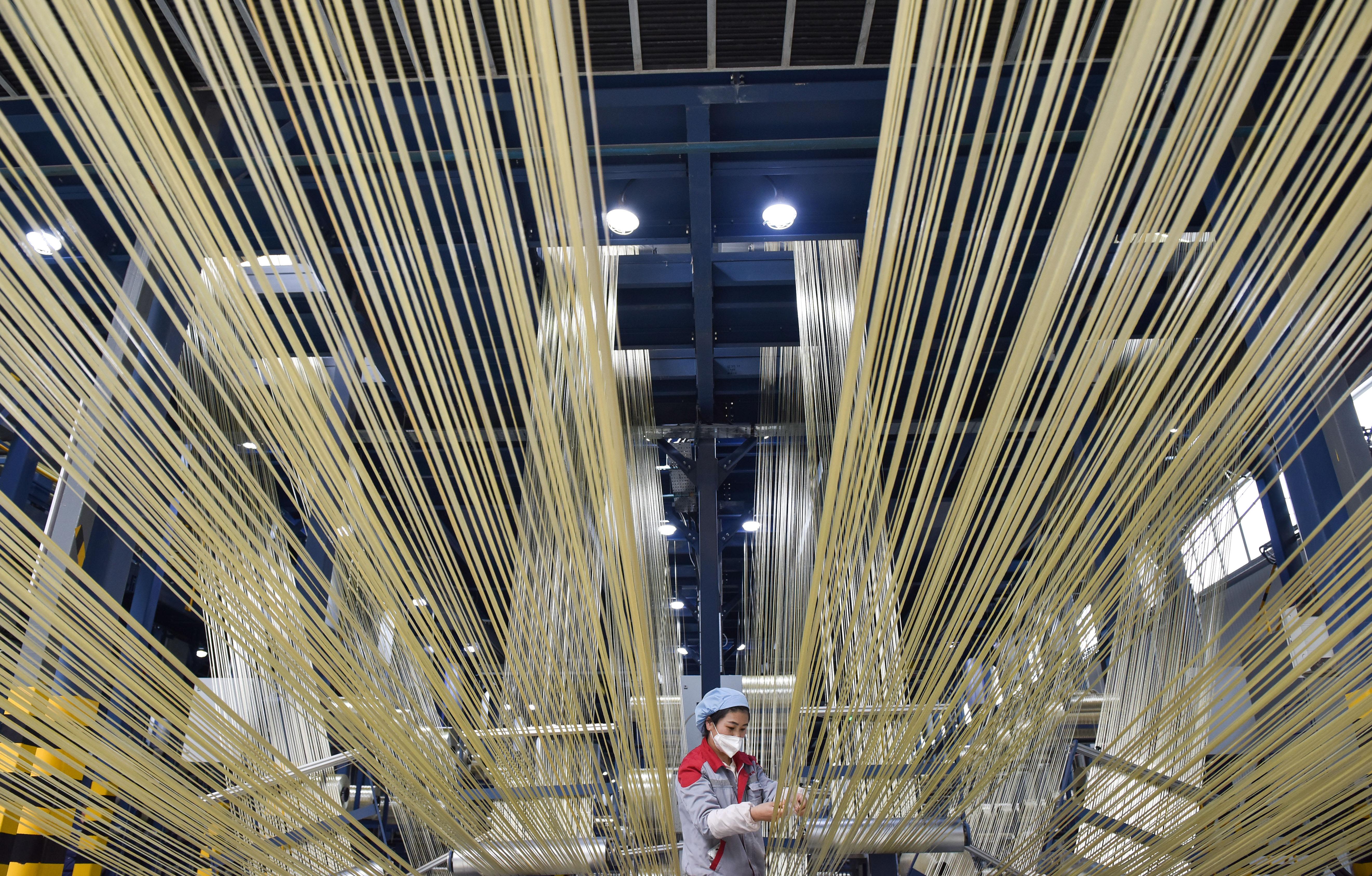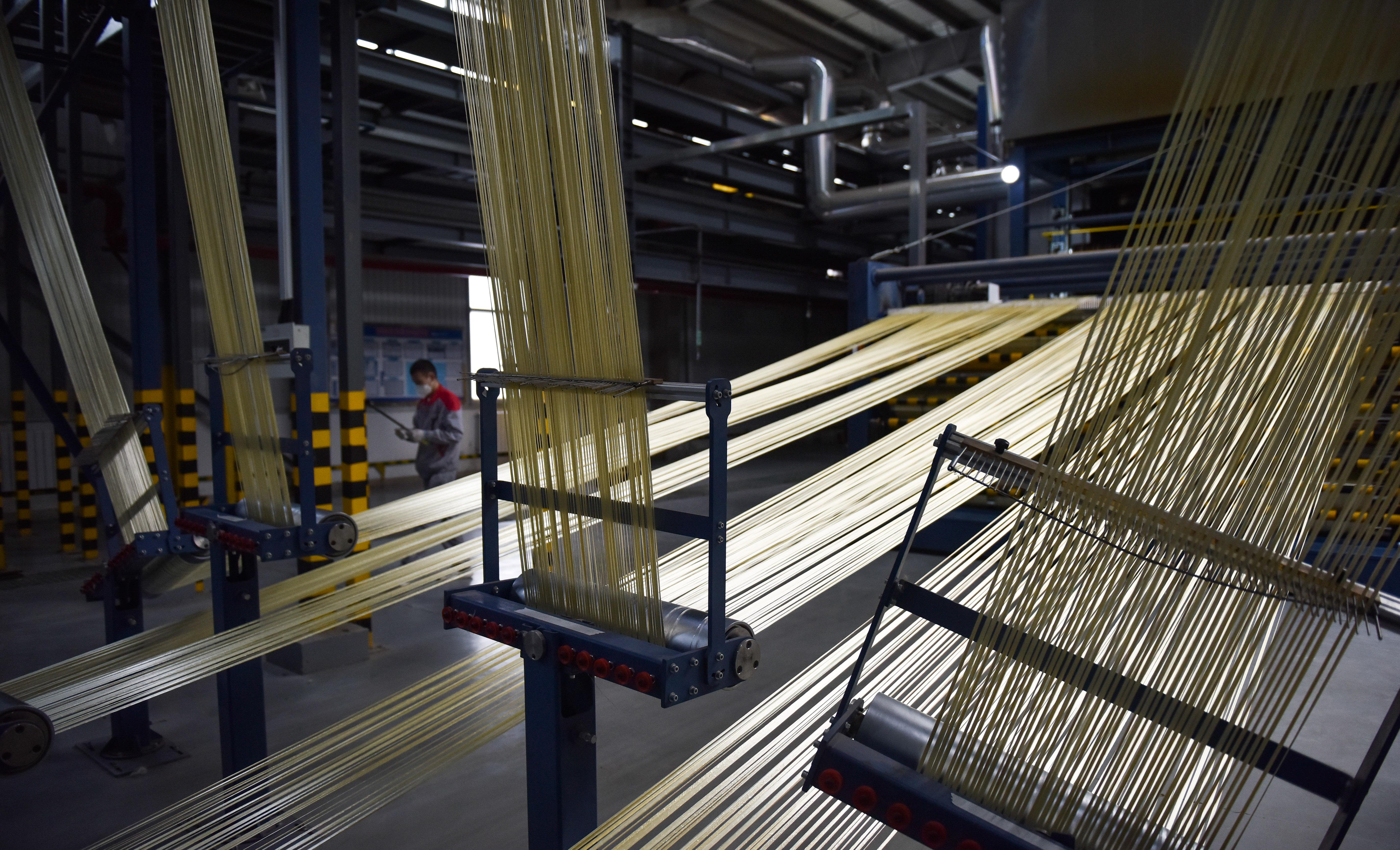 2月22日,在中复神鹰碳纤维西宁有限公司,工作人员在整理碳纤维原丝。 新华社记者 吴刚 摄
