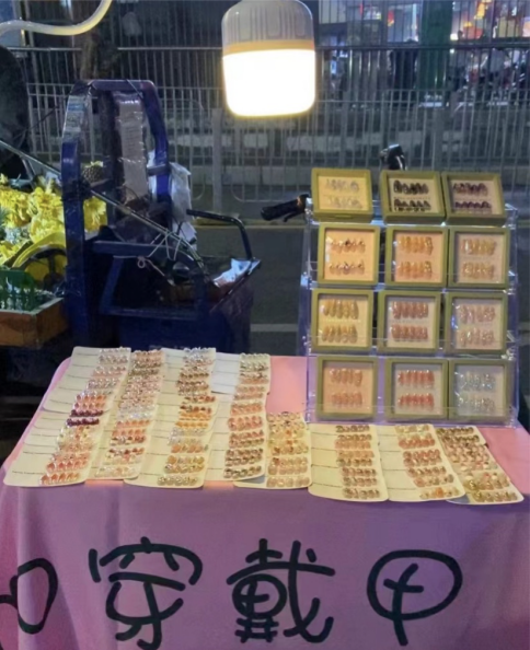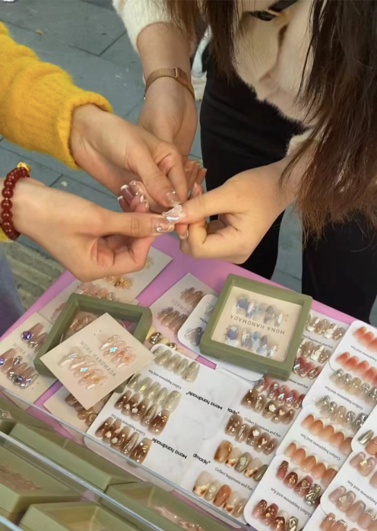 说干就干,星星从朋友那里批发了同为女孩子喜欢的穿戴甲产品,带上家里的小推车,就开始练摊了,“成本加起来也就百元左右”。准备出摊前,星星难免有些紧张,头一天就在脑子里模拟着各种销售的场景,不过第一天就给了她很大的惊喜,“我摊子还没摆好就有很多小姐姐围了上来,大家一起试戴,讨论喜欢的样式和花式,出摊1小时就收入了425元,这给了我很大的鼓励。”