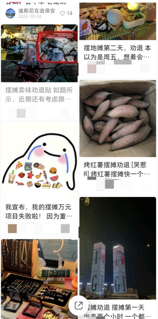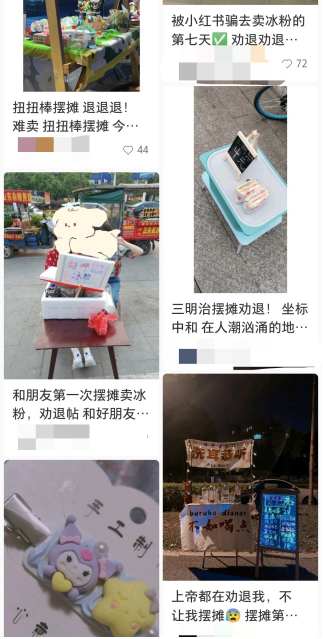 随手搜索多个平台,“日入五百、月入上万”的帖子随处可见,令人心动的想要推起小车就进场,企图成为唛唛爸或者星星这样的幸运者。但同样也有很多“不要盲目摆摊”的劝退例子,在一片分享摆地摊收入不菲的红火局面中撕开了一个令人冷静的口子。