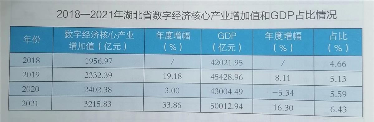 4月7日,极目新闻记者获悉,湖北省数字经济发展报告(2022年)日前发布,统计数据显示,2018-2021年全省数字经济核心产业增加值从1956.97亿元增长到3215.83亿元,年均增速达到18.01%,远高于同期GDP增速。
