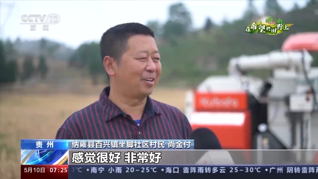 纳雍县百兴镇坐脚社区村民尚金付:感觉很好,非常好。像我们这边这块地有四亩左右,用人工来收割,可能要四个人一天,而且还非常累。但是用这个小麦收割机来割,只需要十多分钟就把它收割了,效果非常好,非常省事。