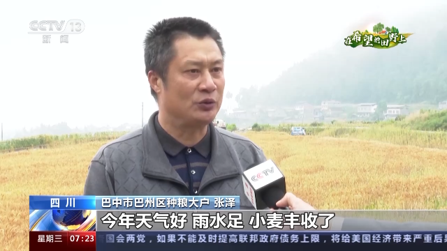 四川省巴中市巴州区种粮大户张泽:今年天气好,雨水足,小麦丰收了,像这样一亩地产量500公斤,在去年的基础上增加了50公斤左右,这对于我们山区来说,非常不容易。
