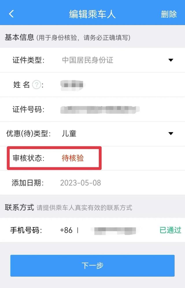 如果小朋友是第一次网络购票,可能会遇到儿童身份“待核验”的情况。