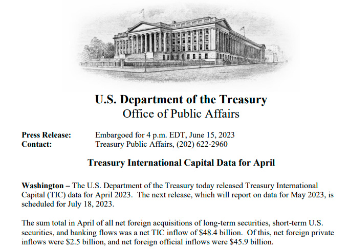 美国财政部发布的国际资本流动报告(TIC)内容还显示,4月份外国对美国长期、短期证券和银行流水的净买入额为484亿美元。其中,外国私人资金净流入为25亿美元,外国官方资金净流入为459亿美元。