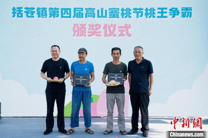 他们是今年高山蜜露桃节“桃王”荣誉的获得者,他们选送的蜜露桃在评比中以456.2克的重量夺得第一。