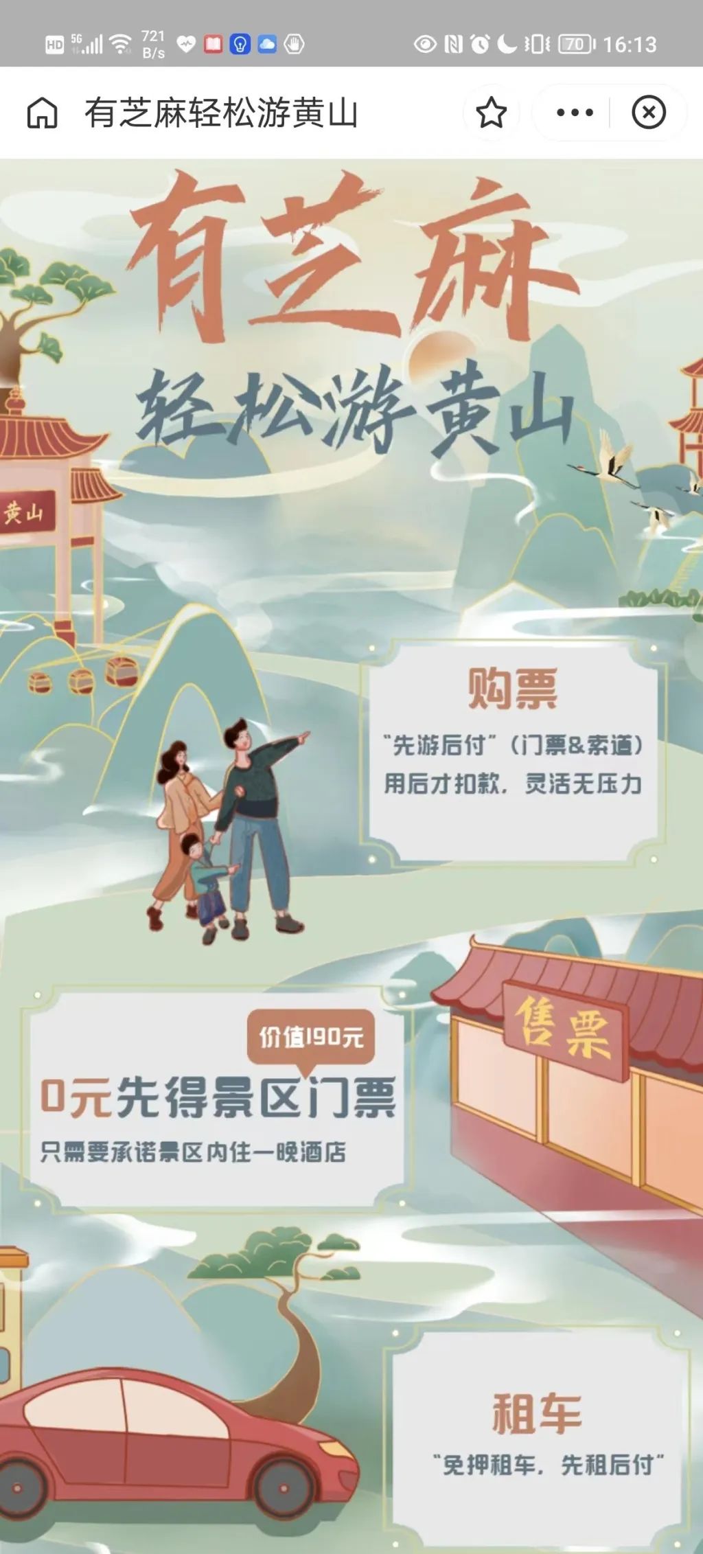 去年9月,黄山旅游发展股份有限公司联合支付宝芝麻信用推出“信用游”,黄山成为全国首个“先游后付”景区。据了解,“先游后付”模式,指支付宝芝麻分550分以上的用户到黄山风景区旅游,在支付宝平台黄山小程序里下单,可以0元预订景区门票、索道票,先游后付、不用不付,灵活安排出行时间。同时,还可免押入住酒店,住后极速退房;免押租车,先租后付。