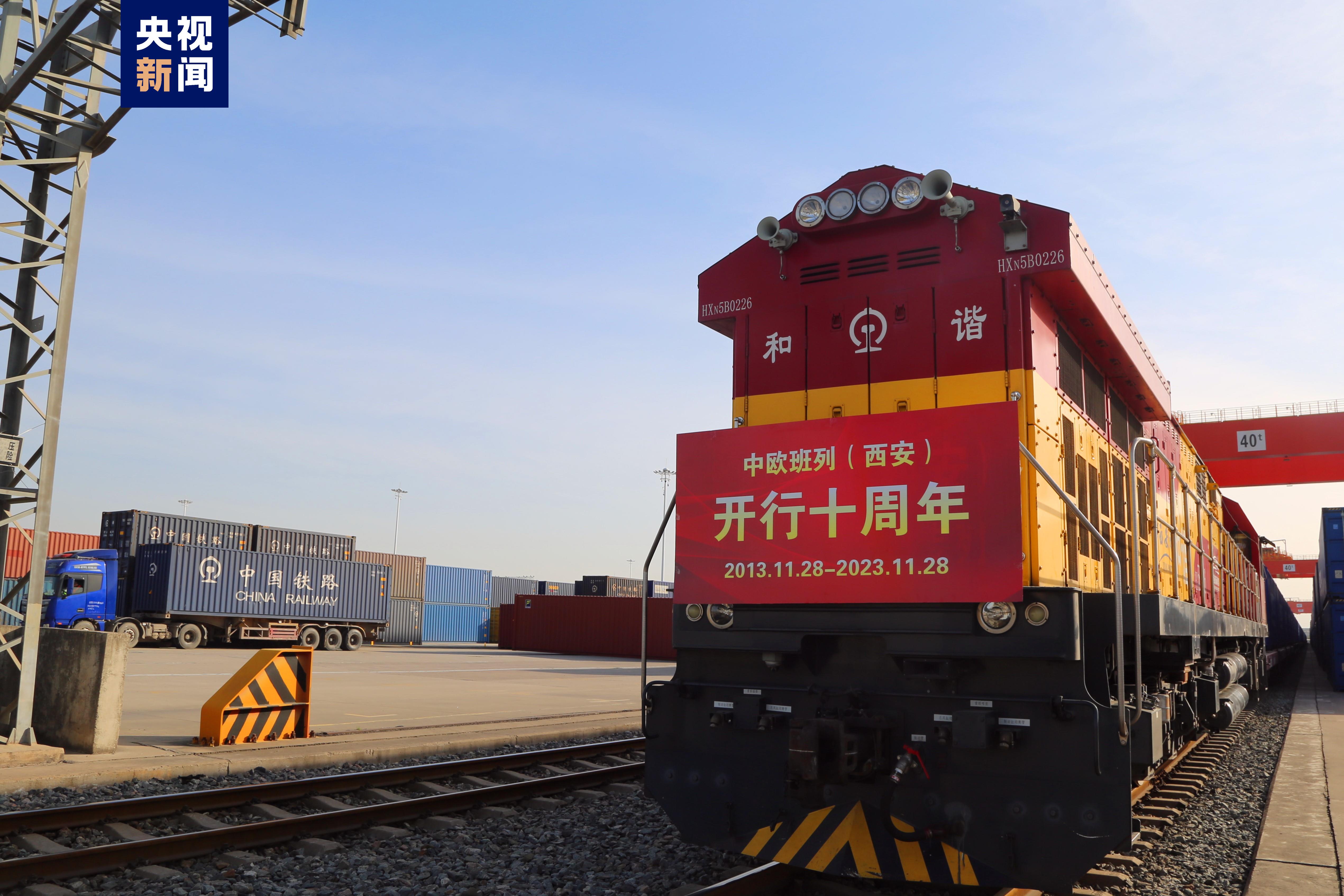 11月28日上午,随着一声汽笛长鸣,满载着日用百货、健身器材、服装等货物的X8155次中欧班列从西安国际港站缓缓驶出,一路向西开往德国汉堡,这标志着中欧班列(西安)自2013年11月28日开行首趟以来,已累计开行十周年。