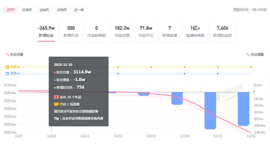 灰豚数据显示,从12月10日起,东方甄选持续“掉粉”。12月10日,东方甄选的粉丝总量为3114.9万,而截至发稿,东方甄选的粉丝为2848.2万,已“掉粉”267万。