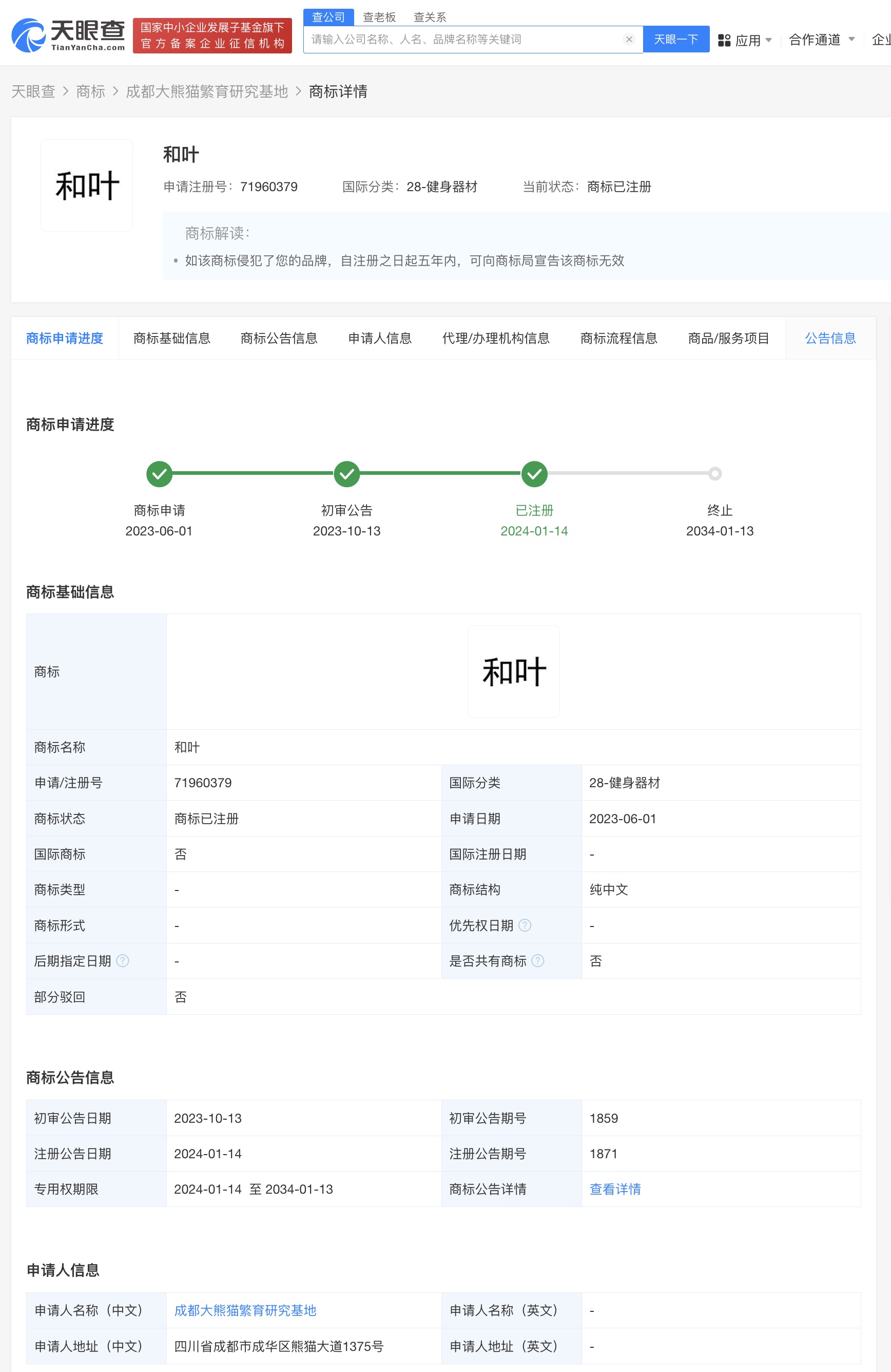 天眼查App显示,2023年5月、6月,成都大熊猫繁育研究基地申请注册了多枚“和叶”“熊猫基地和叶”“熊猫和叶”商标,国际分类涉及运输贮藏、健身器材、科学仪器等。不久前,上述部分商标已成功注册。