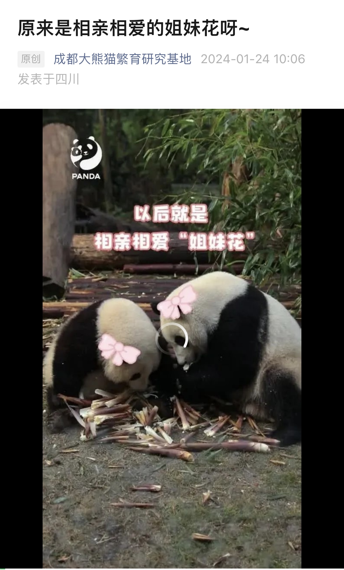 1月24日,“和叶 弟弟变妹妹”登上微博热搜。在成都大熊猫繁育研究基地公众号发布的视频里,谭爷爷对着“和花”“和叶”温柔呼喊着“两姐妹”。原来,经生物样本鉴定,以前被大家认定为雄性的和叶其实是雌性。