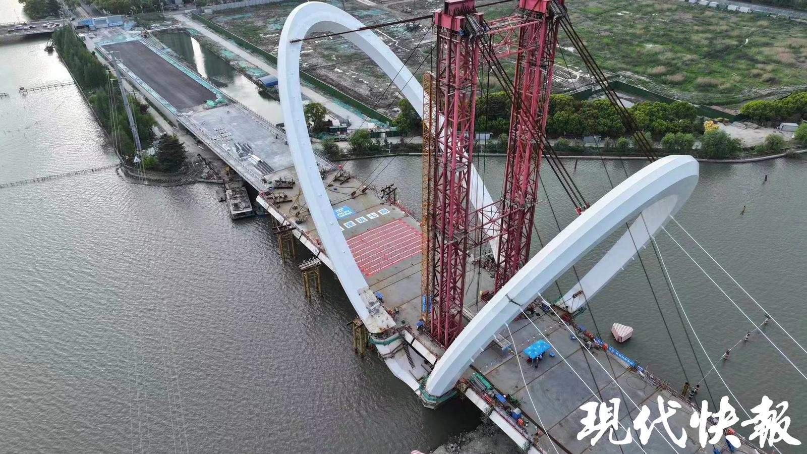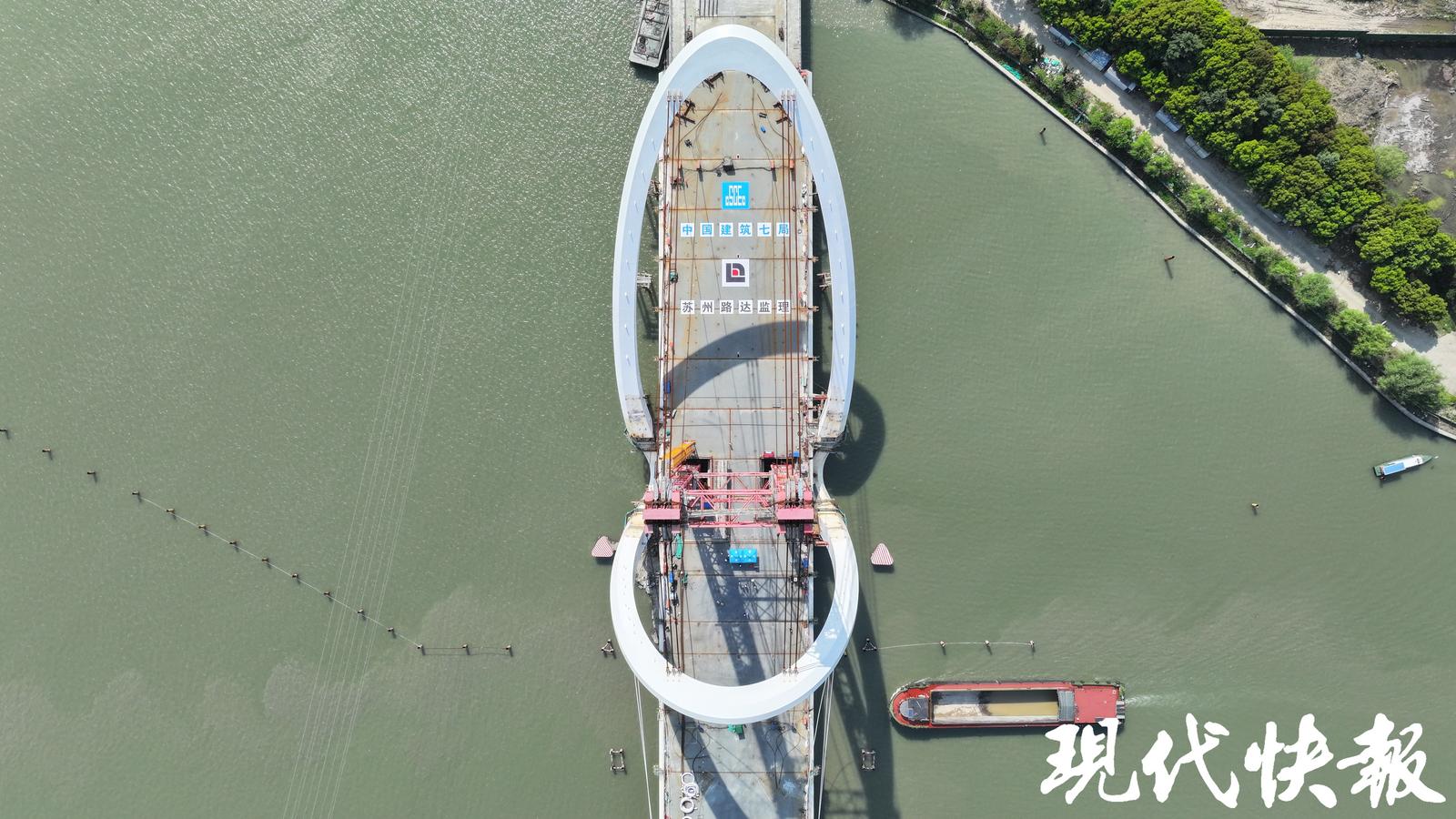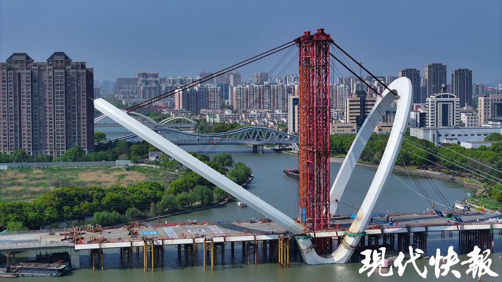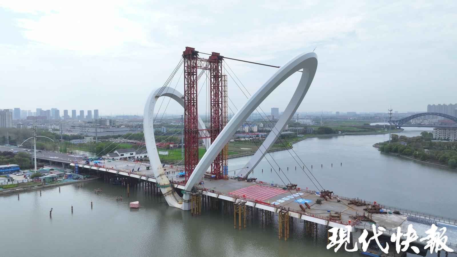 两翼齐展震川桥,并蒂莲开青阳港。作为震川桥项目的最关键环节,大小钢拱塔竖向转体成功为项目建设带来新的飞跃。下一步,苏州交投集团交建公司将紧锣密鼓推进转体塔架拆除、塔间索和后续斜拉索安装张拉作业,有序开展桥梁附属工程施工,全力冲刺6月份通车目标。