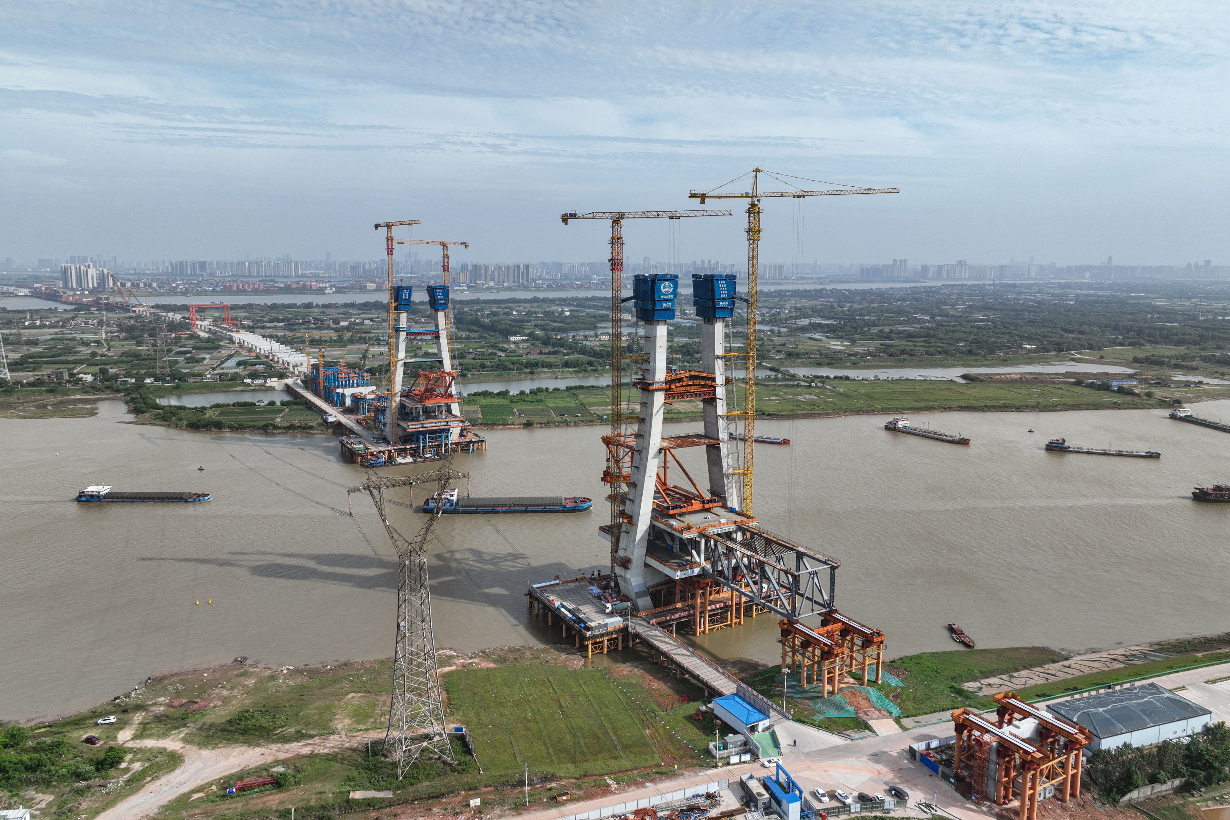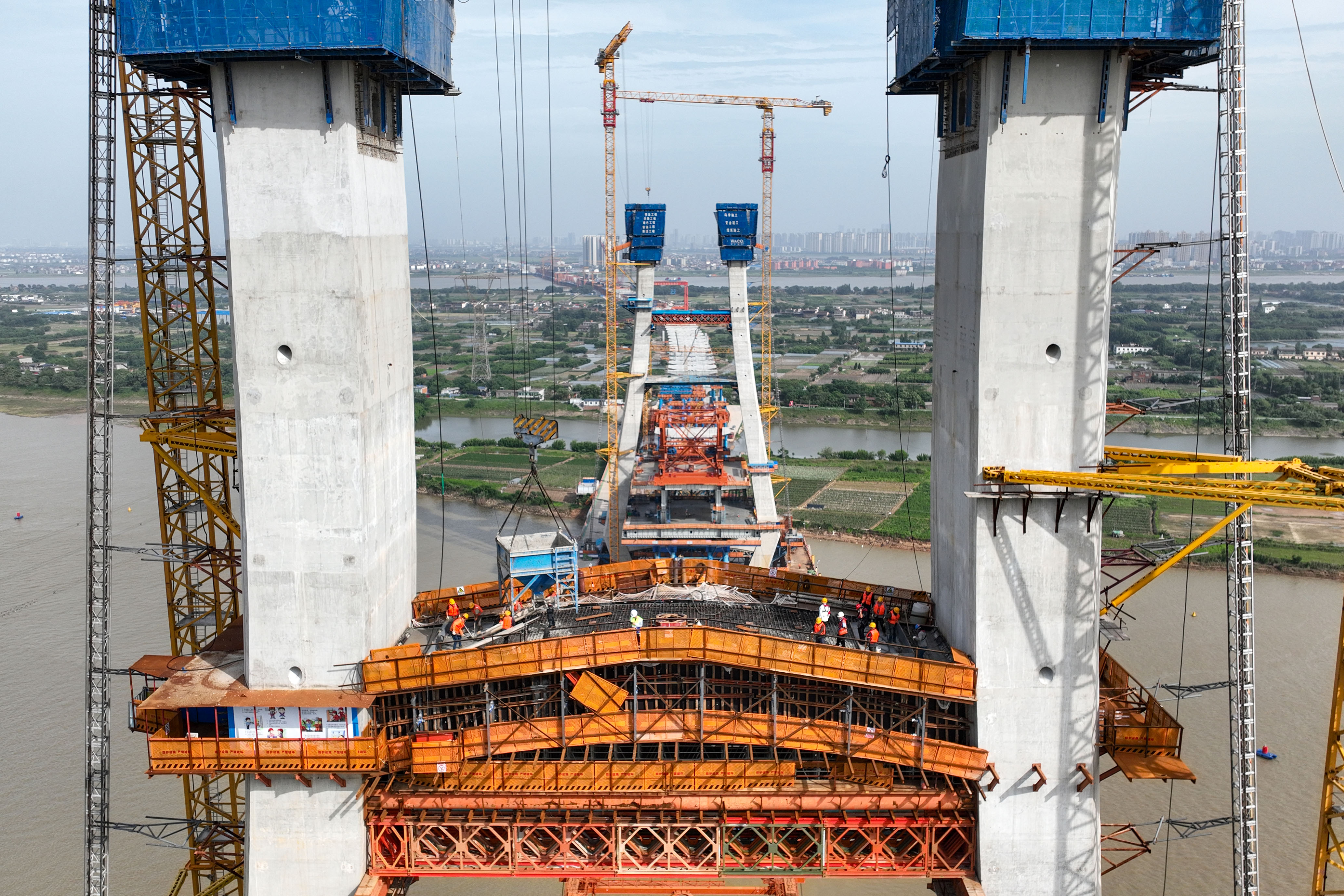 昌九高铁南昌扬子洲赣江公铁大桥设计为公铁上、下层混层设置钢桁梁斜拉桥,跨西支主桥全长760米,主跨320米,主塔为空间H型曲线结构,塔高144.6米。此次浇筑的中横梁离栈桥顶面80米,长21.7米,横梁断面设计为单箱单室截面,截面高3米、宽5.8米,分两次浇筑完成。隆兴大桥最显著的结构造型——“昌”字钢结构,其锚固件将提前预埋进此次浇筑的中横梁中,为下一步“书写”“昌”字做好了准备工作。