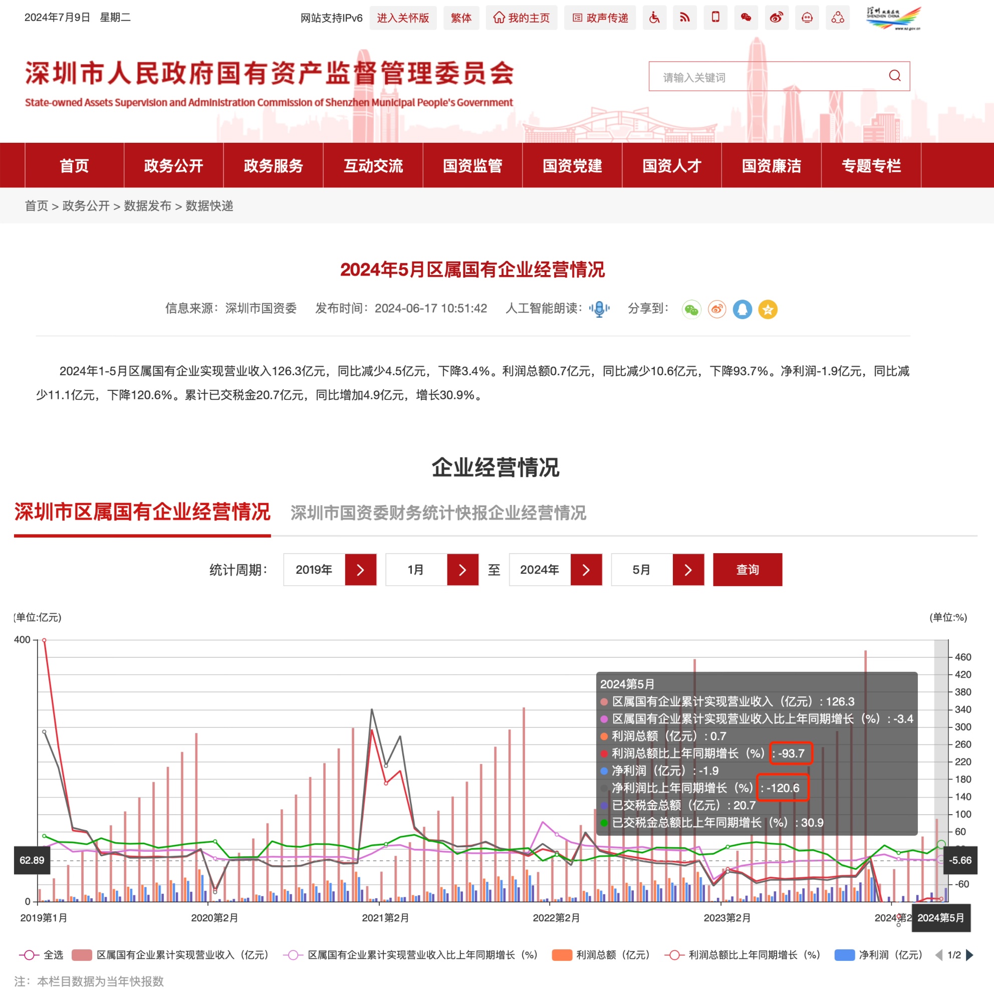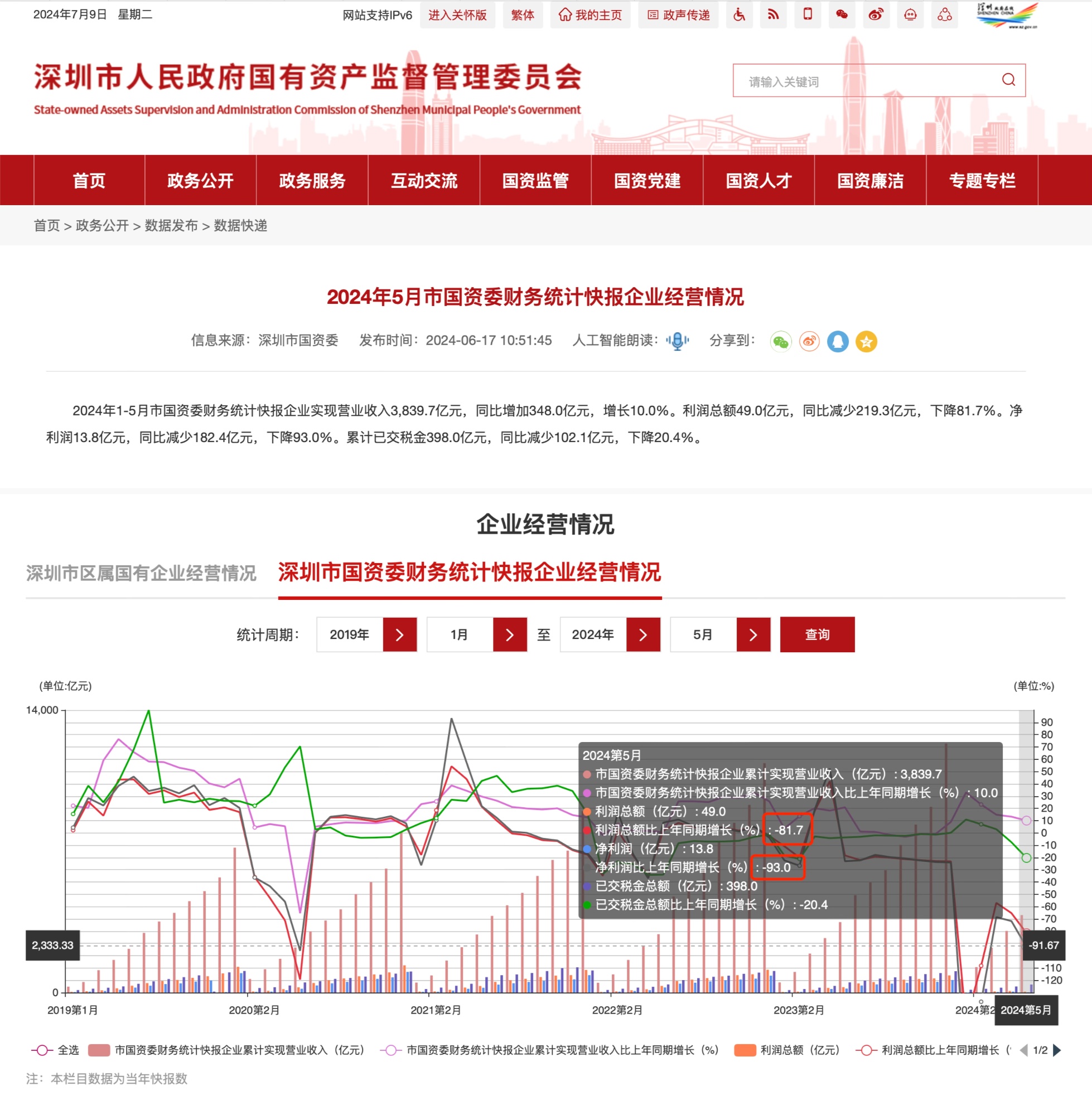 2024年5月市国资委财务统计快报企业经营情况(央广网发深圳市人民政府国有资产监督管理委员会官网截图)