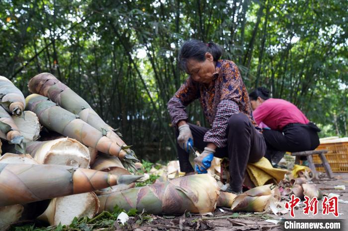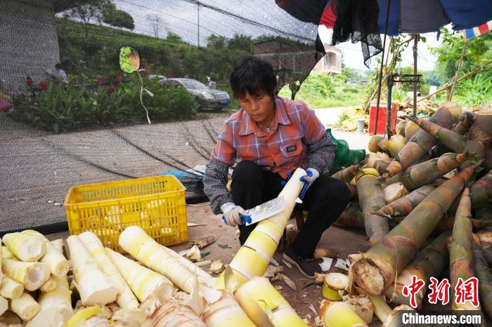 近日,在广西玉林市兴业县山心镇蓬塘村,郁郁葱葱的竹林里,麻竹笋长势喜人。眼下正是麻竹笋“冒尖尖”的时节,兴业县笋农们穿梭在竹林间忙着采挖麻竹笋供应市场,麻竹种植产业成为当地民众致富产业。麻竹笋以肉质厚实、鲜嫩可口、口感清脆深受市场欢迎,有“岭南山珍”之誉。图为工人在剥笋。李宇常 摄