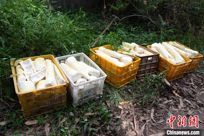 近日,在广西玉林市兴业县山心镇蓬塘村,郁郁葱葱的竹林里,麻竹笋长势喜人。眼下正是麻竹笋“冒尖尖”的时节,兴业县笋农们穿梭在竹林间忙着采挖麻竹笋供应市场,麻竹种植产业成为当地民众致富产业。麻竹笋以肉质厚实、鲜嫩可口、口感清脆深受市场欢迎,有“岭南山珍”之誉。图为等待装车运输的竹笋。谭伊辰 摄