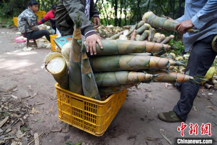 近日,在广西玉林市兴业县山心镇蓬塘村,郁郁葱葱的竹林里,麻竹笋长势喜人。眼下正是麻竹笋“冒尖尖”的时节,兴业县笋农们穿梭在竹林间忙着采挖麻竹笋供应市场,麻竹种植产业成为当地民众致富产业。麻竹笋以肉质厚实、鲜嫩可口、口感清脆深受市场欢迎,有“岭南山珍”之誉。图为收购商在采购麻竹笋。李宇常 摄