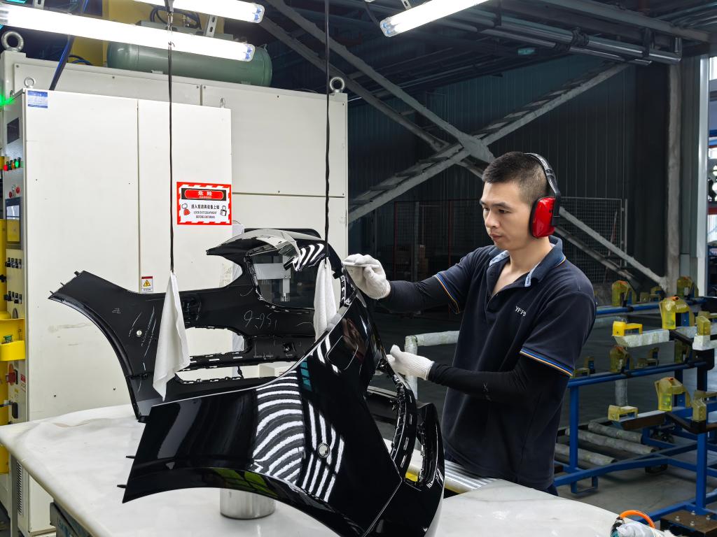 在延锋彼欧(大庆)汽车外饰系统有限公司,工人正在对保险杠进行质检。新华社记者孙晓宇摄