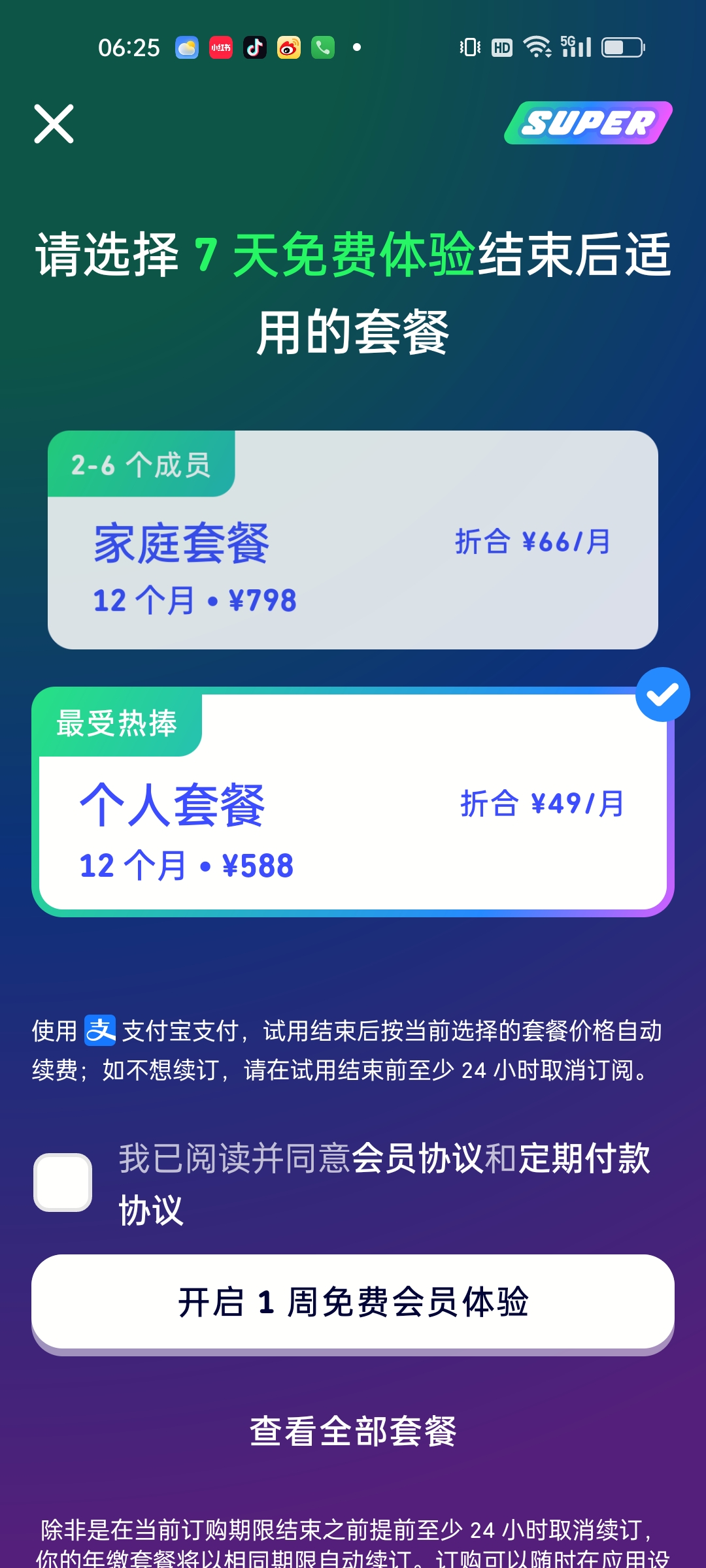 如果选择点击免费体验1周,页面会进入请选择7天免费体验结束后适用的套餐,显示有2个套餐选项,分别是12个月588元个人套餐和798元家庭套餐,页面下方也提醒,试用结束后按当前选择的套餐价格自动续费,如不想续订,请在试用结束前24小时取消订阅,订购可以随时在应用设置中取消,无需支付任何费用。