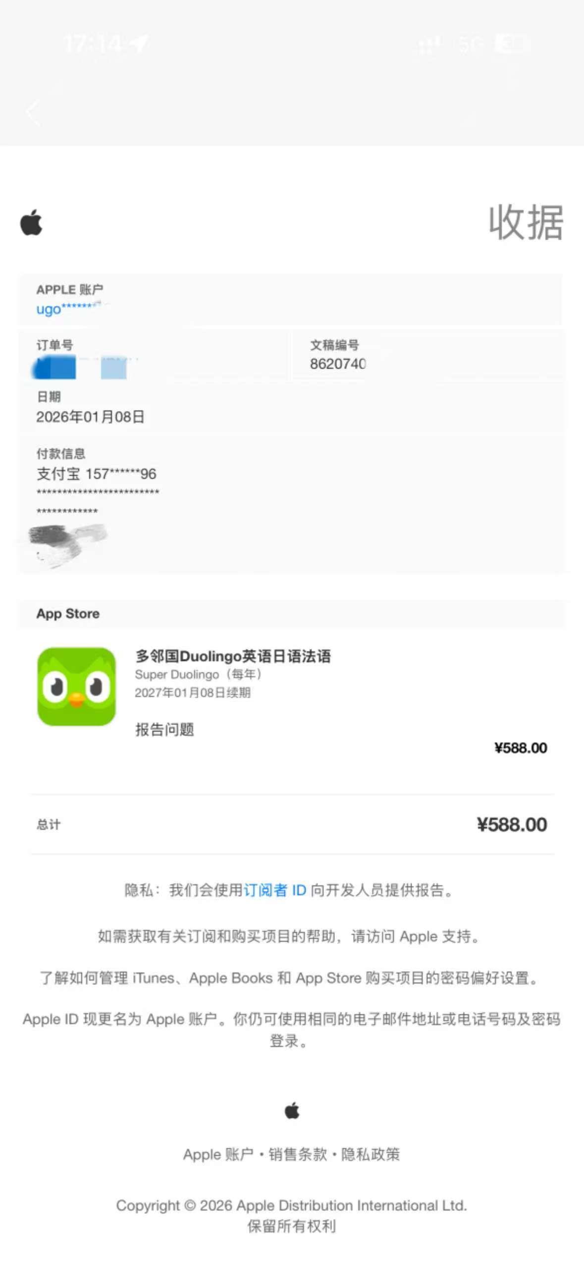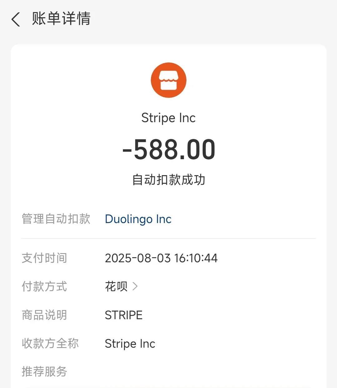 1月8日上午9时许,卢同学发现当天早晨5:49分收到一条银行扣款短信,被扣金额588元,她查询看到扣费项目是多邻国Duolingo英语、日语、法语。卢同学告诉极目新闻记者,扣款前,她并未收到多邻国的任何通知提醒,她回想起开通免费体验时,多邻国曾要求她扫脸支付通过Applepay确认,当时后台显示消费明细是0,但当她发现被直接扣款后,再找当时这笔0元消费明细时,却不见了,显示的只是588元的实际扣款。