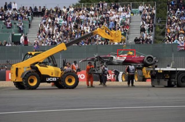由于在英国大奖赛发车后遭遇撞车,周冠宇的赛车当时倒扣着冲出赛道,横向进入砂石缓冲区。由于砂石缓冲区的阻滞作用,赛车最终翻过轮胎墙,卡在人员通道中。而从事后被吊起的周冠宇的赛车看,防滚架部分已经在倒扣滑行时完全被磨掉,而周冠宇之所以并无大碍,是由于被称为“人字拖”的HALO系统发挥了支撑作用。