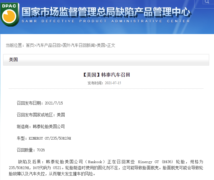 另一方面,记者注意到,韩泰轮胎还曾因有胎面分离的潜在问题,于2021年在美国发起过召回,召回了某些KinergyGT(H436)轮胎,规格为235/50R19H,DOT代码为0521。召回原因具体为:轮胎制造时使用的固化剂不足,可能导致胎面脱壳。胎面脱壳可能会导致轮胎故障以及汽车失控,从而增大发生撞车的风险。此次召回涉及轮胎数量为7026个。为此,通用汽车公司随后也召回了部分配备韩泰轮胎的车型,包括2021-2022年款雪佛兰Equinox和GMCTerrain汽车。