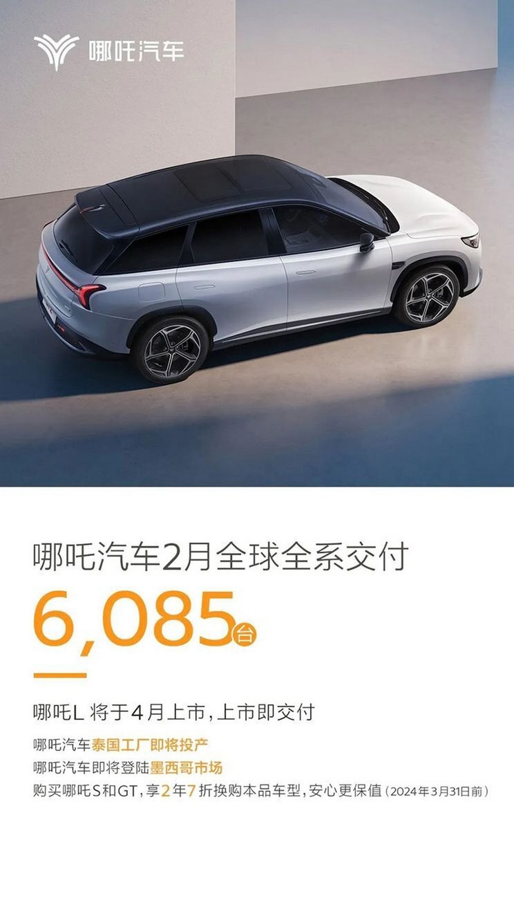 据哪吒汽车官方数据,在2024年前两个月,哪吒汽车交付量约为1.6万辆。2月哪吒汽车交付量仅6085辆,同比下降近四成。
