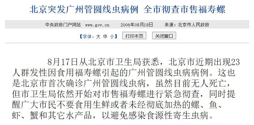 还记得2006年7月份发生在北京的广州管圆线虫疫情吗?原因正是食客们在餐馆食用凉拌福寿螺导致感染广州管圆线虫,共涉及一百余例患者,很多患者出现了头痛、抽搐等症状。