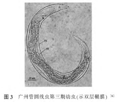 广州管圆线虫第3期幼虫在人体内移行经过中枢神经系统可发育为第4期幼虫和第5期幼虫,因为人体不是广州管圆线虫的正常宿主,所以不能下行至肺动脉发育为成虫,便会长期移行于神经系统,诱发脑膜炎,但在儿童体内有可能会发育为成虫。