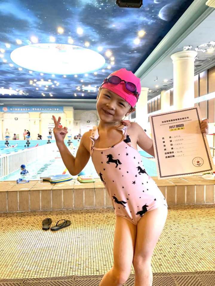 每次三四千米的训练量,书瑶硬是咬牙坚持下来,不仅熟练掌握四种泳姿,50米自由泳还能游进45秒。“这两年说不心疼肯定是假的,但我们一直告诉她运动就是永不放弃的精神,而她也确实做到了。”